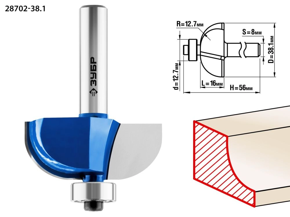 ПроизводителиФреза кром. калев. №2, D= 38,1мм, раб. дл.-16мм, рад.-12,7мм, хв.-8мм, d-12,7мм (28702-38.1) ЗУБР