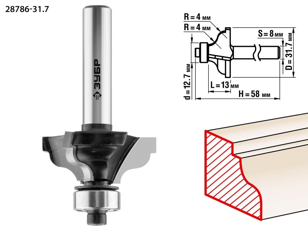 ПроизводителиФреза кром. калев. №3, диам.-31.7мм, раб. дл.-13мм, рад.-4мм, хв. 8мм (28786-31.7) ЗУБР