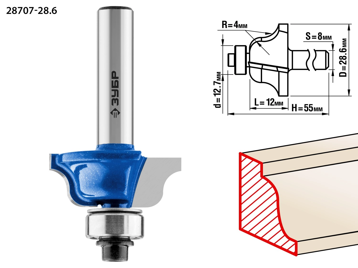 ПроизводителиФреза кром. калев. №6, D= 28,6мм, раб. дл.-12мм, рад.-4мм, хв.-8мм, d-12,7мм (28707-28.6) ЗУБР