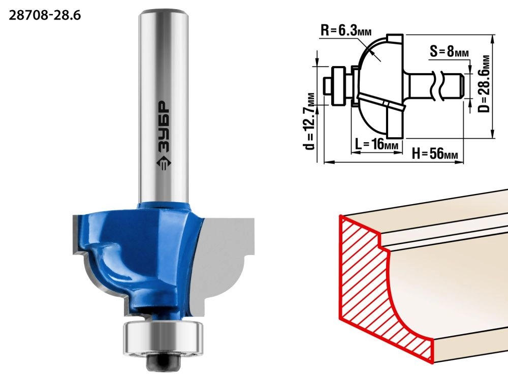 ХарактеристикиАртикул 28708-28.6Бренды ЗубрСтрана производства КитайТип изделия калевочнаяРабочая длина, мм 12,7Длина, мм 56Диаметр, мм 28,6Хвостовик 8Радиус, мм 6,3Диаметр подшипника, мм 12.7Вес 0.071Фреза отлично подходит для скругления кромок при обработке столешниц, полок, шкафов и прочих работ с разнообразными видами древесины