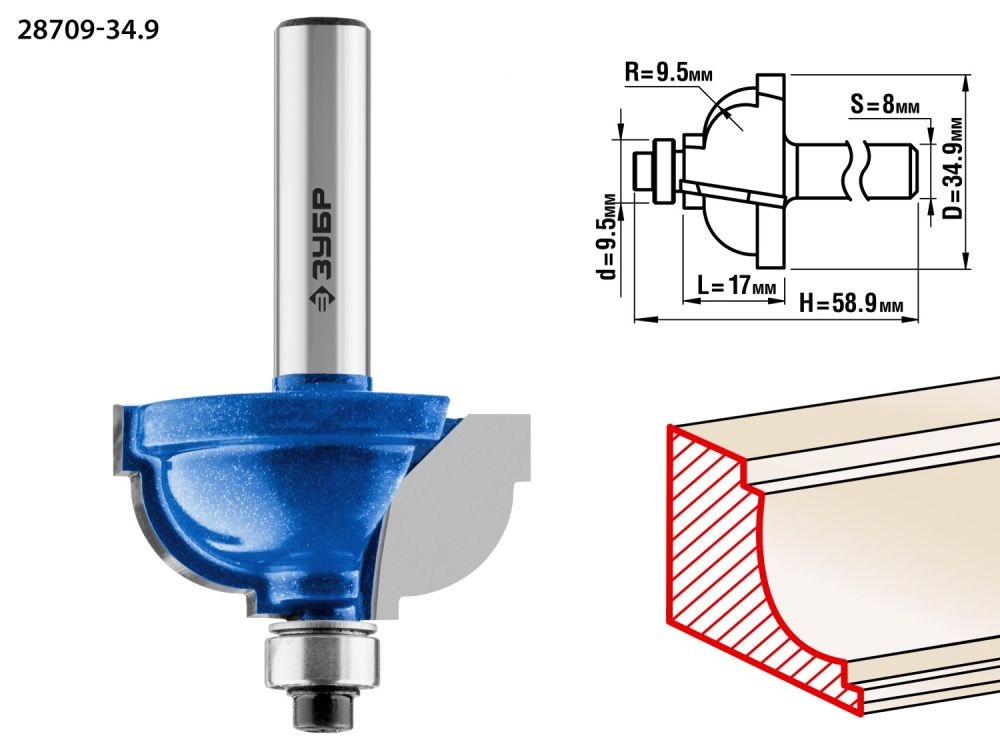 ХарактеристикиАртикул 28709-34.9Бренды ЗубрСтрана производства КитайТип изделия калевочнаяРабочая длина, мм 17Длина, мм 58.9Диаметр, мм 34,9Хвостовик 8Радиус, мм 9,5Диаметр подшипника, мм 9.5Вес 0.102Фреза отлично подходит для скругления кромок при обработке столешниц, полок, шкафов и прочих работ с разнообразными видами древесины