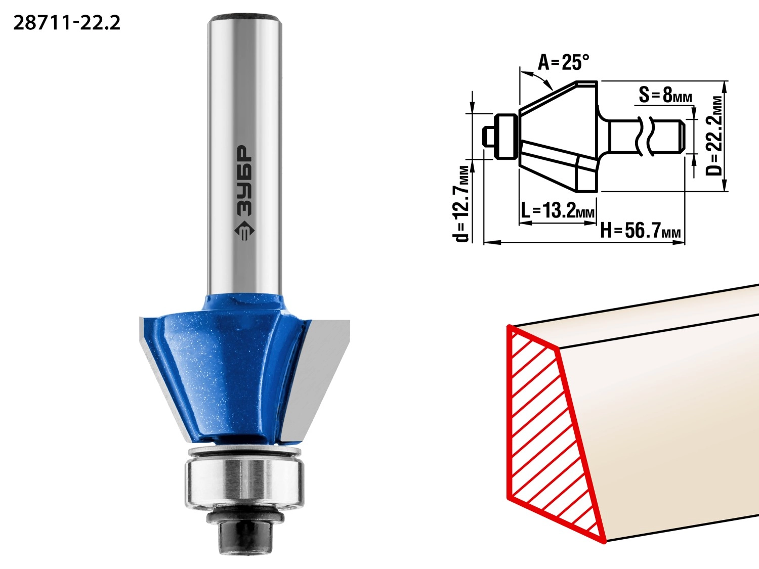 ХарактеристикиАртикул 28711-22.2Бренды ЗубрСтрана производства КитайТип изделия калевочнаяРабочая длина, мм 13,2Длина, мм 56.7Диаметр, мм 22,2Хвостовик 8Угол,° 25Диаметр подшипника, мм 12.7Вес 0.065Фреза отлично подходит для изготовления фаски с заданным углом на кромках деталей при обработке столешниц, полок, шкафов и прочих работ с разнообразными видами древесины