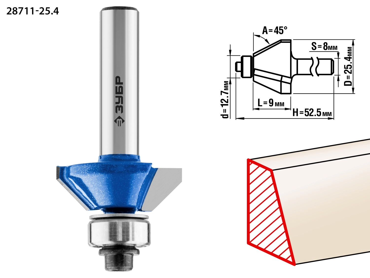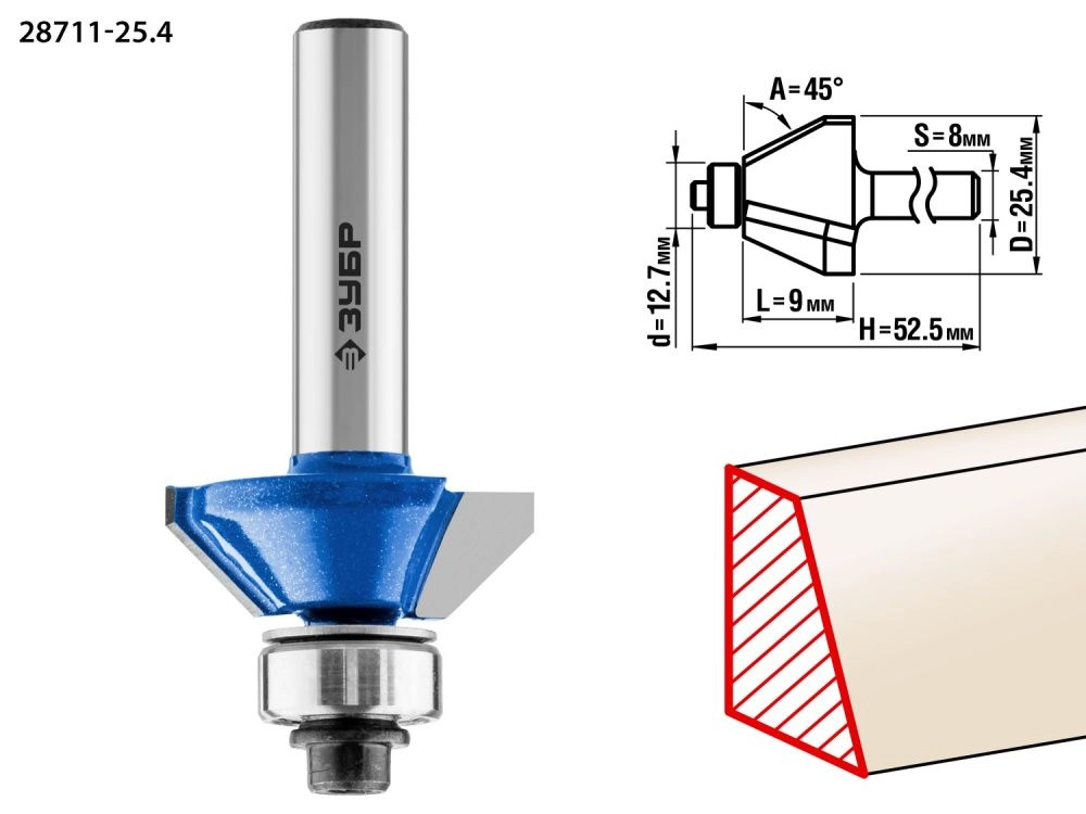 ХарактеристикиАртикул 28711-25.4Бренды ЗубрСтрана производства КитайТип изделия калевочнаяРабочая длина, мм 9Длина, мм 52.5Диаметр, мм 25,4Хвостовик 8Угол,° 45Диаметр подшипника, мм 12.7Вес 0.066Фреза отлично подходит для изготовления фаски с заданным углом на кромках деталей при обработке столешниц, полок, шкафов и прочих работ с разнообразными видами древесины