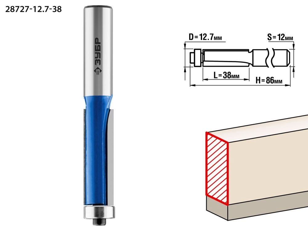ПроизводителиФреза кром. с нижним подшип., D= 12,7мм, раб. дл.-38мм, хв.-12мм, d-12,7мм (28727-12.7-38) ЗУБР