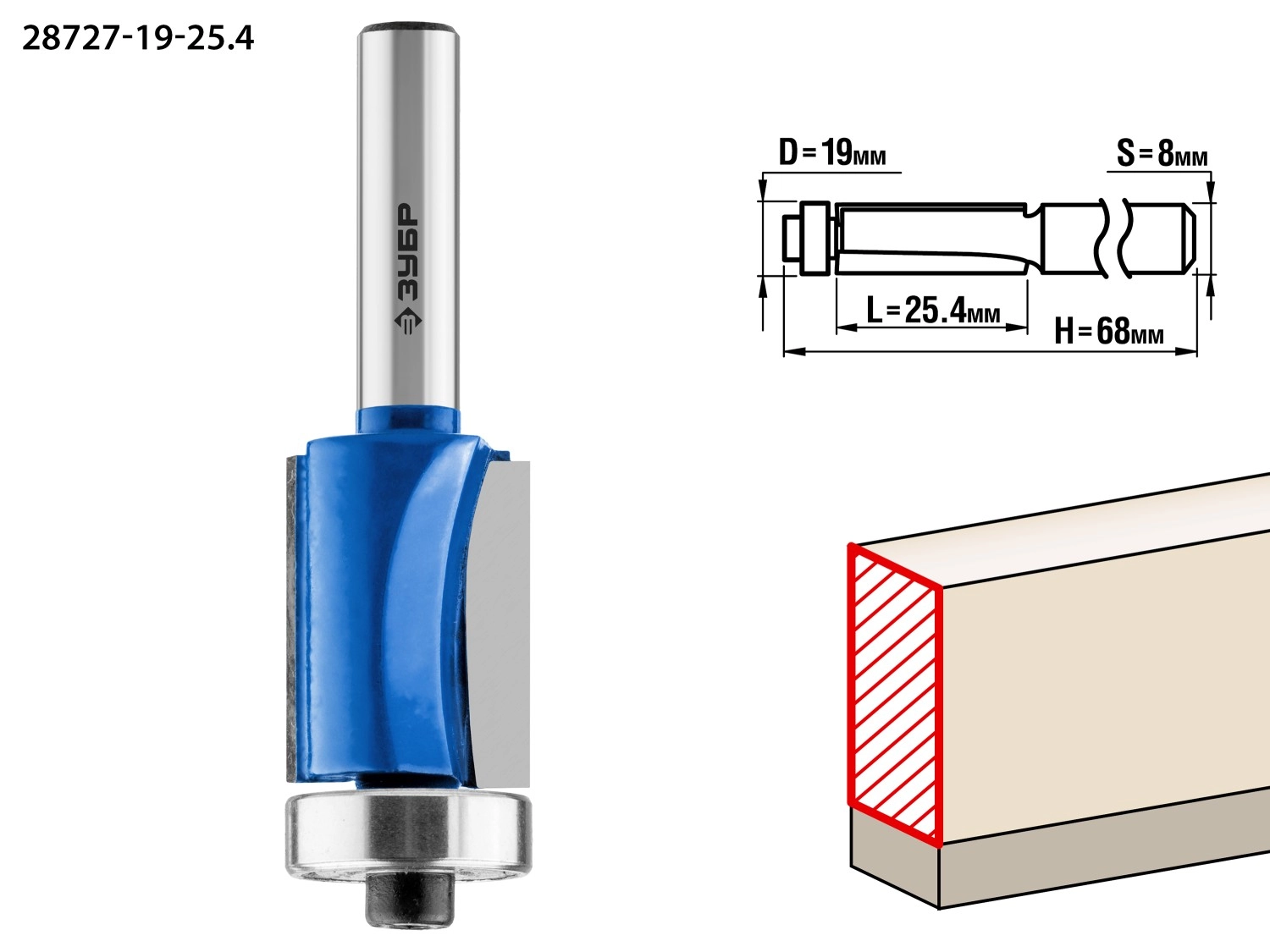 ПроизводителиФреза кромочная с нижним подшип., D= 19мм, раб. длина-25,4мм, хв.-8мм, d-19мм (28727-19-25.4) ЗУБР