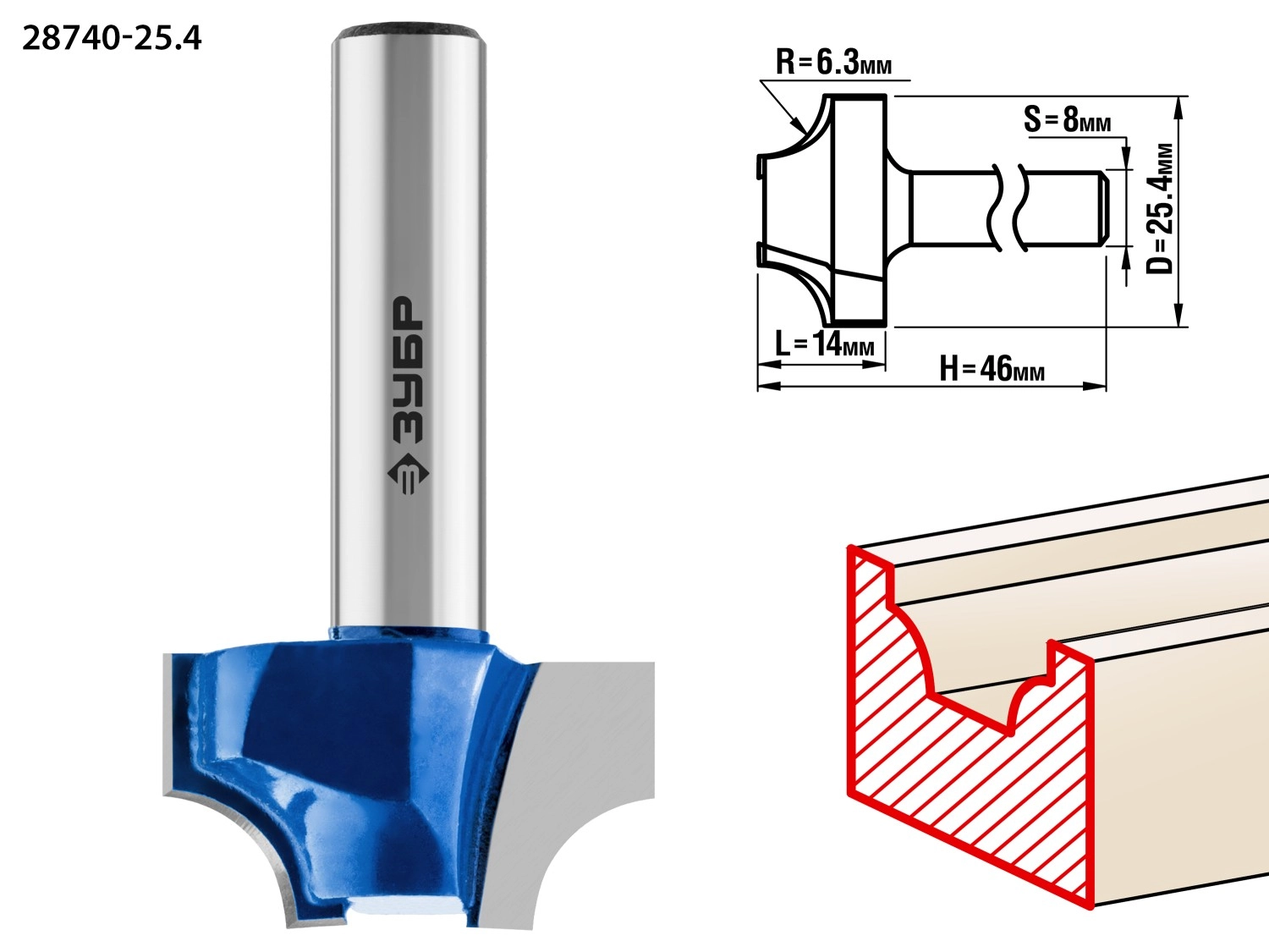 ПроизводителиФреза пазовая фасонная №1, D= 25,4мм, рабочая длина-14мм, радиус-6,3мм, хв.-8 мм (28740-25.4) ЗУБР