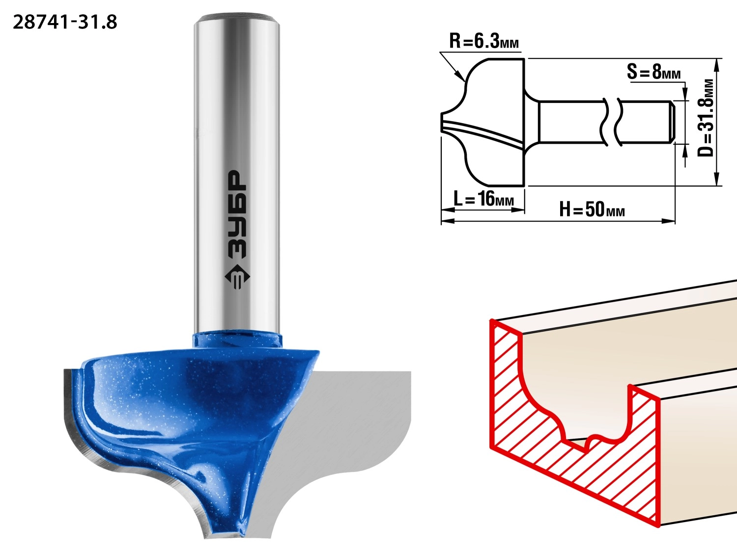 ПроизводителиФреза пазовая фасонная №2, D= 31,8мм, рабочая длина-16мм, радиус-6,35мм, хв.-8 мм (28741-31.8) ЗУБР