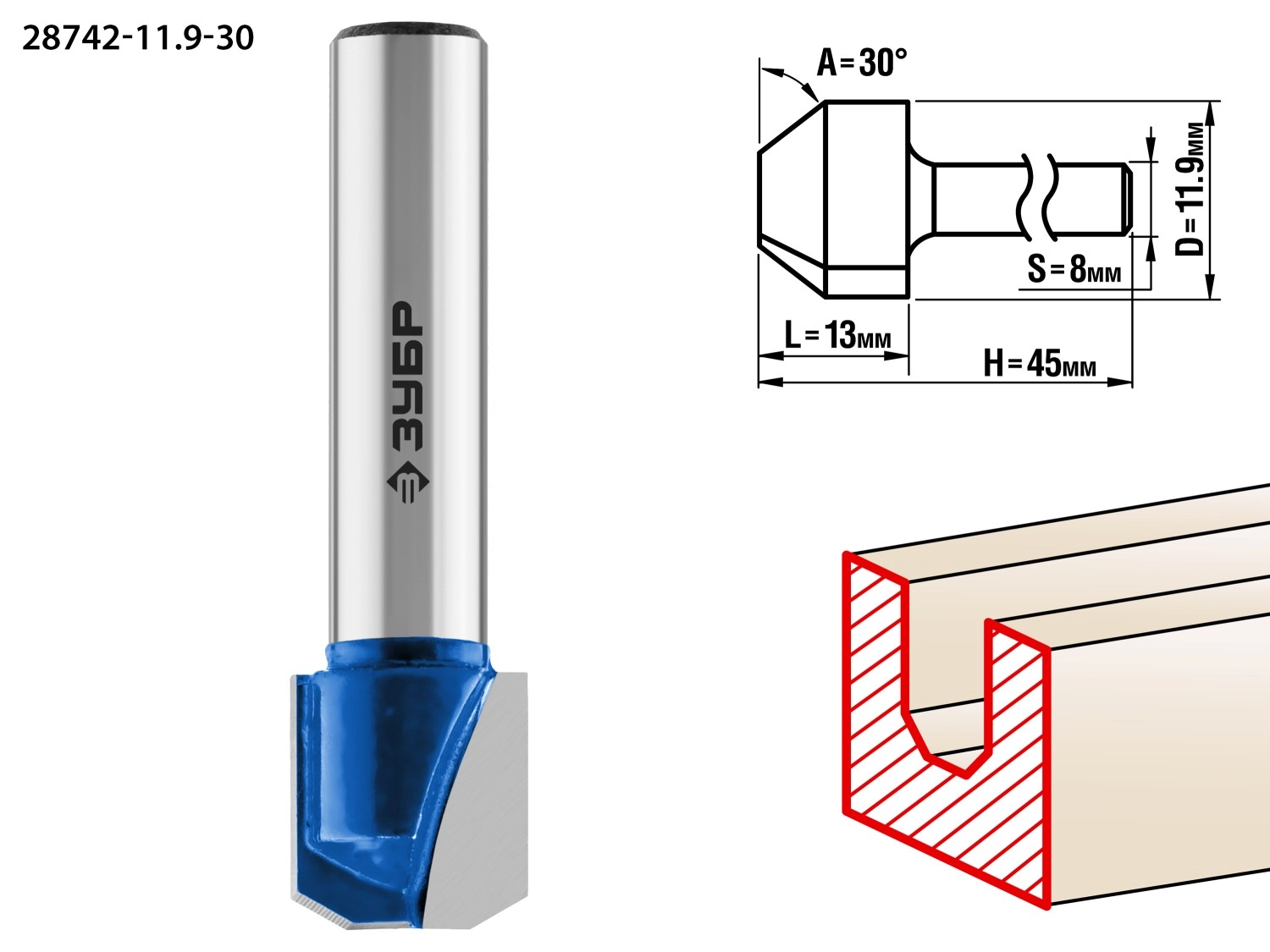 ПроизводителиФреза пазовая фасонная №3, D= 11,9мм, раб. длина-13мм, угол-30 град., хв.-8мм (28742-11.9-30) ЗУБР