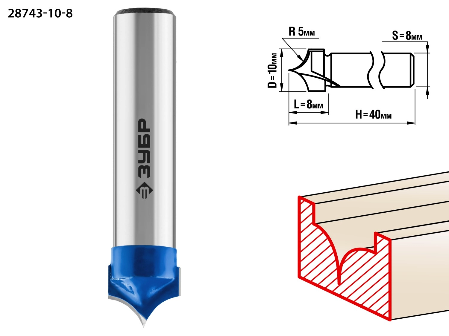 ПроизводителиФреза пазовая фасонная №4, D= 10мм, рабочая длина-8мм, радиус-5мм, хв.-8 мм (28743-10-8) ЗУБР