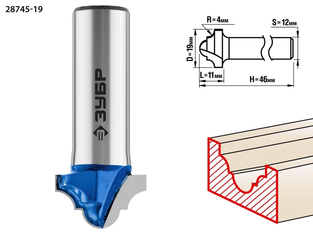 ПроизводителиФреза пазовая фасонная №6, D= 19мм, рабочая длина-11мм, радиус-4мм, хв.-12 мм (28745-19) ЗУБР