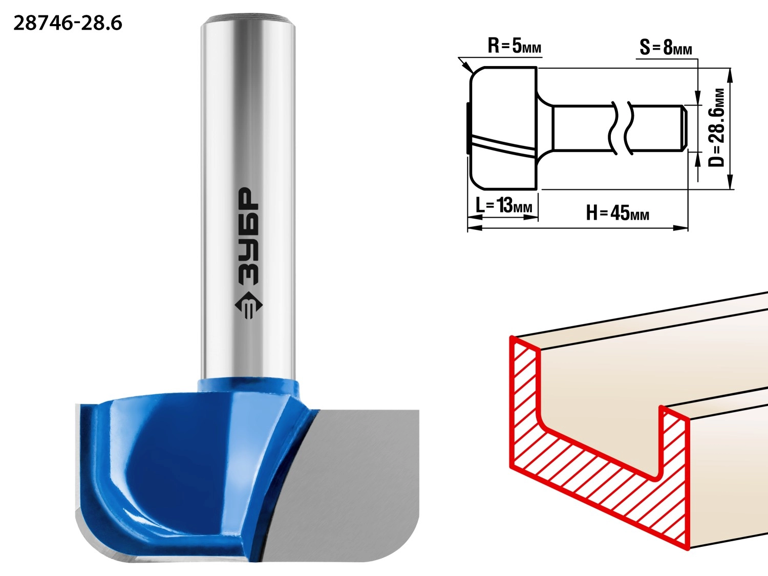 ПроизводителиФреза пазовая фасонная №7, D= 28,6мм, рабочая длина-13мм, радиус-5мм, хв.-8 мм (28746-28.6) ЗУБР