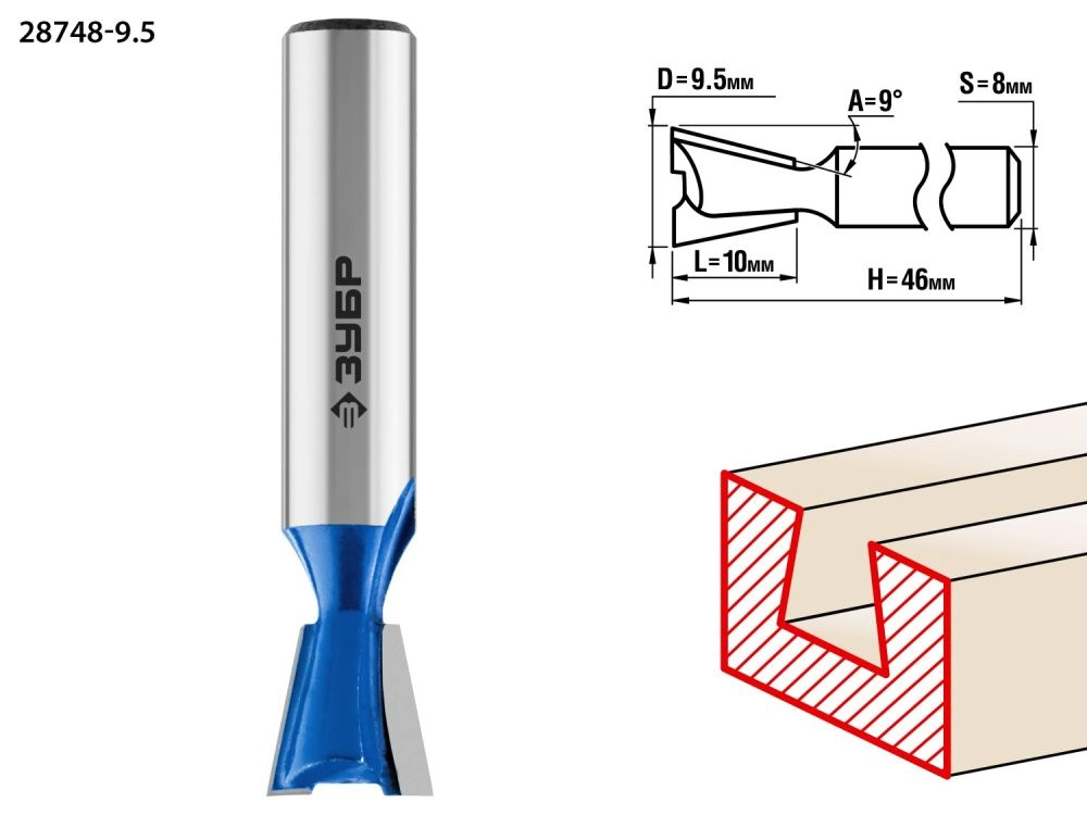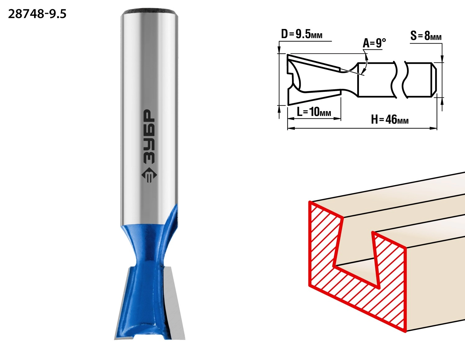 ПроизводителиФреза паз. фасон. "Ласточкин Хвост", D= 9,5мм, раб. дл.-10мм, хв.-8мм (28748-9.5) ЗУБР