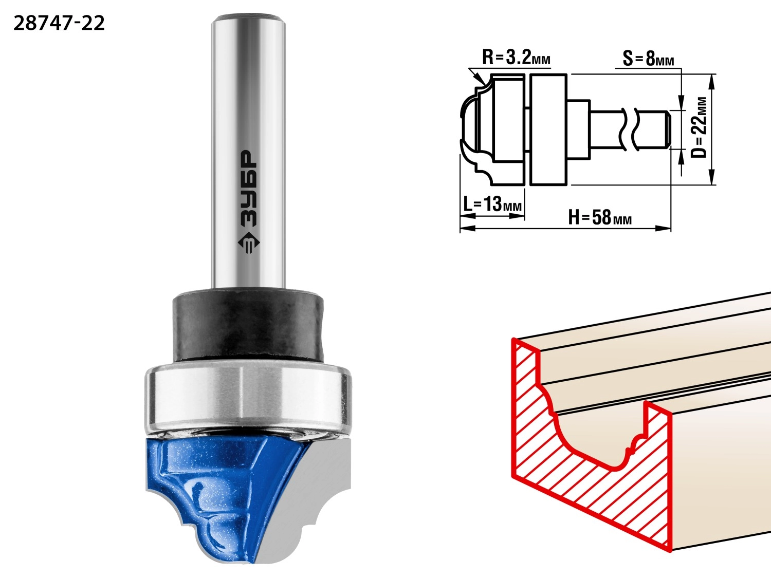 ПроизводителиФреза паз. фасон. с подшип., D= 22мм, раб. дл.-13мм, рад.-3,2мм, хв.-8мм, d-22мм (28747-22) ЗУБР