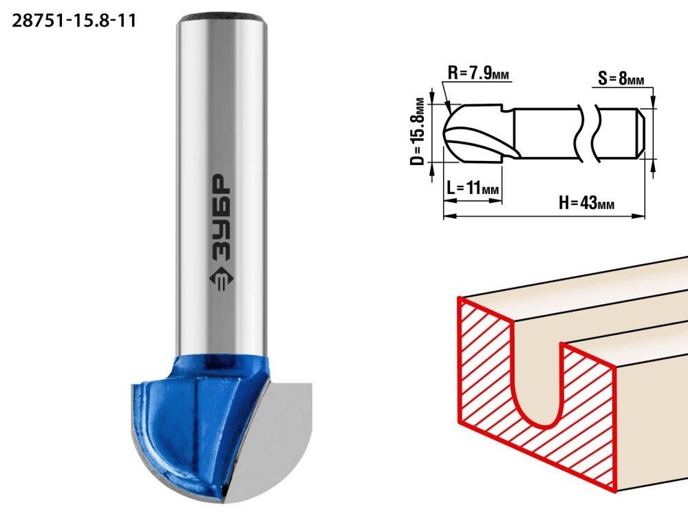 ПроизводителиФреза пазовая галтельная, D= 15,8мм, рабочая длина-11мм, радиус-7,9мм, хв.-8 мм (28751-15.8-11) ЗУБР