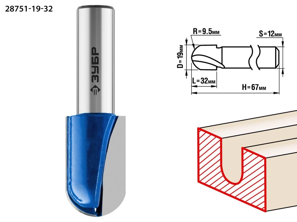 ПроизводителиФреза пазовая галтельная, D= 19мм, рабочая длина-32мм, радиус-9,5мм, хв.-12 мм (28751-19-32) ЗУБР