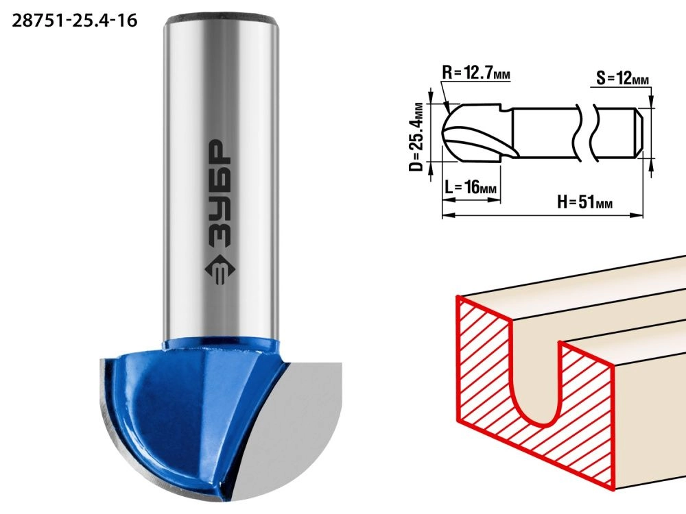 ПроизводителиФреза пазовая галтельная, D= 25,4мм, раб. длина-16мм, радиус-12,7мм, хв.-12 мм (28751-25.4-16) ЗУБР