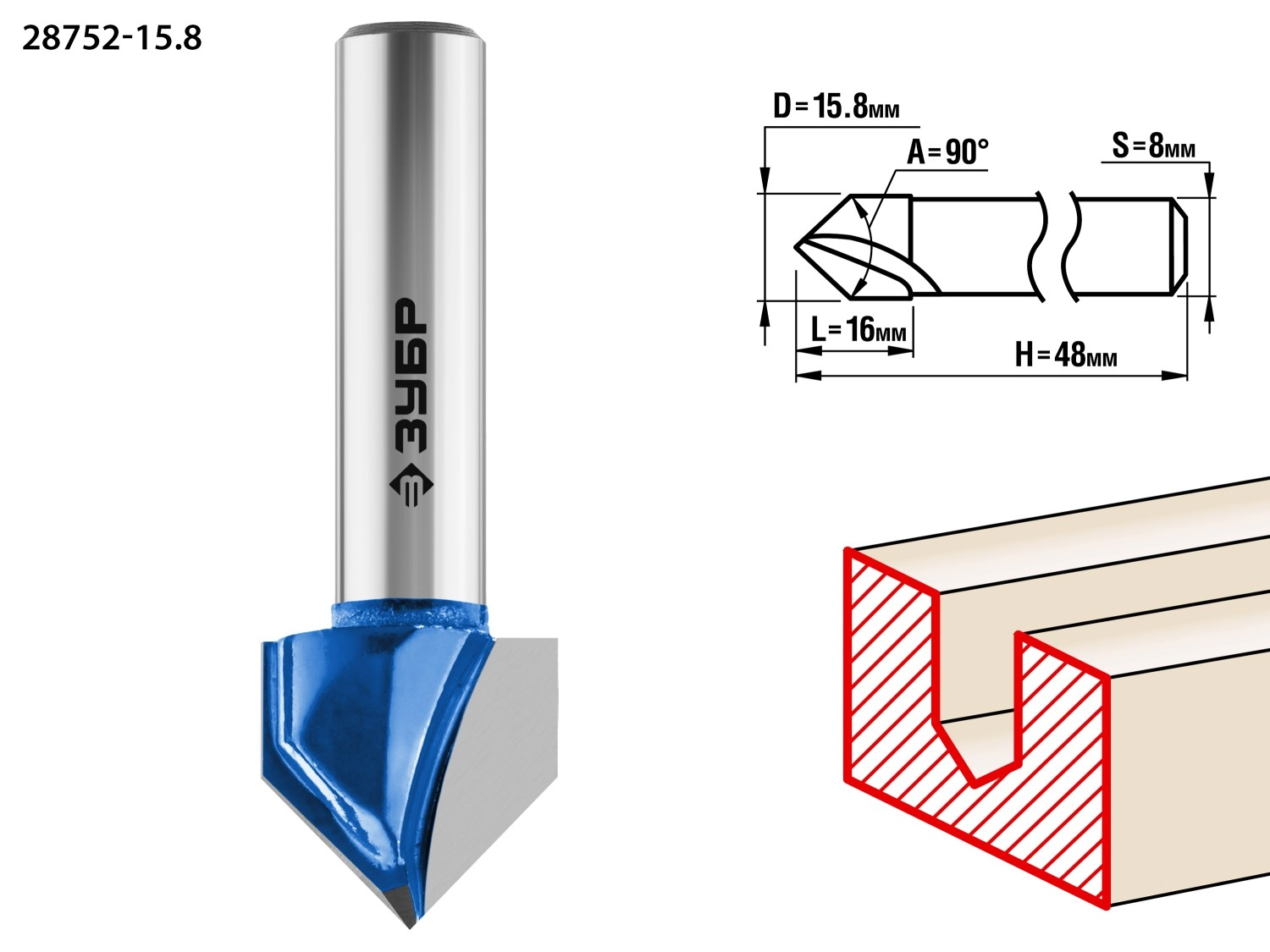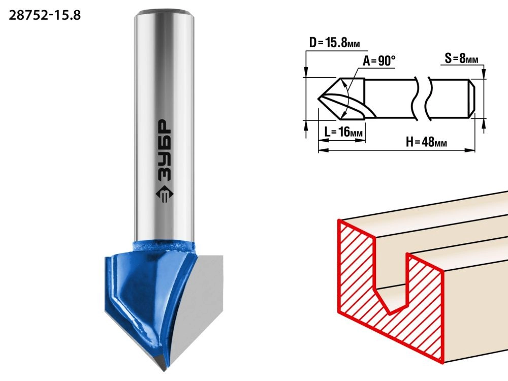 ПроизводителиФреза паз. галт. V-образная, D= 15,8мм, раб. дл.-16мм, угол-90° град., хв.-8мм (28752-15.8) ЗУБР