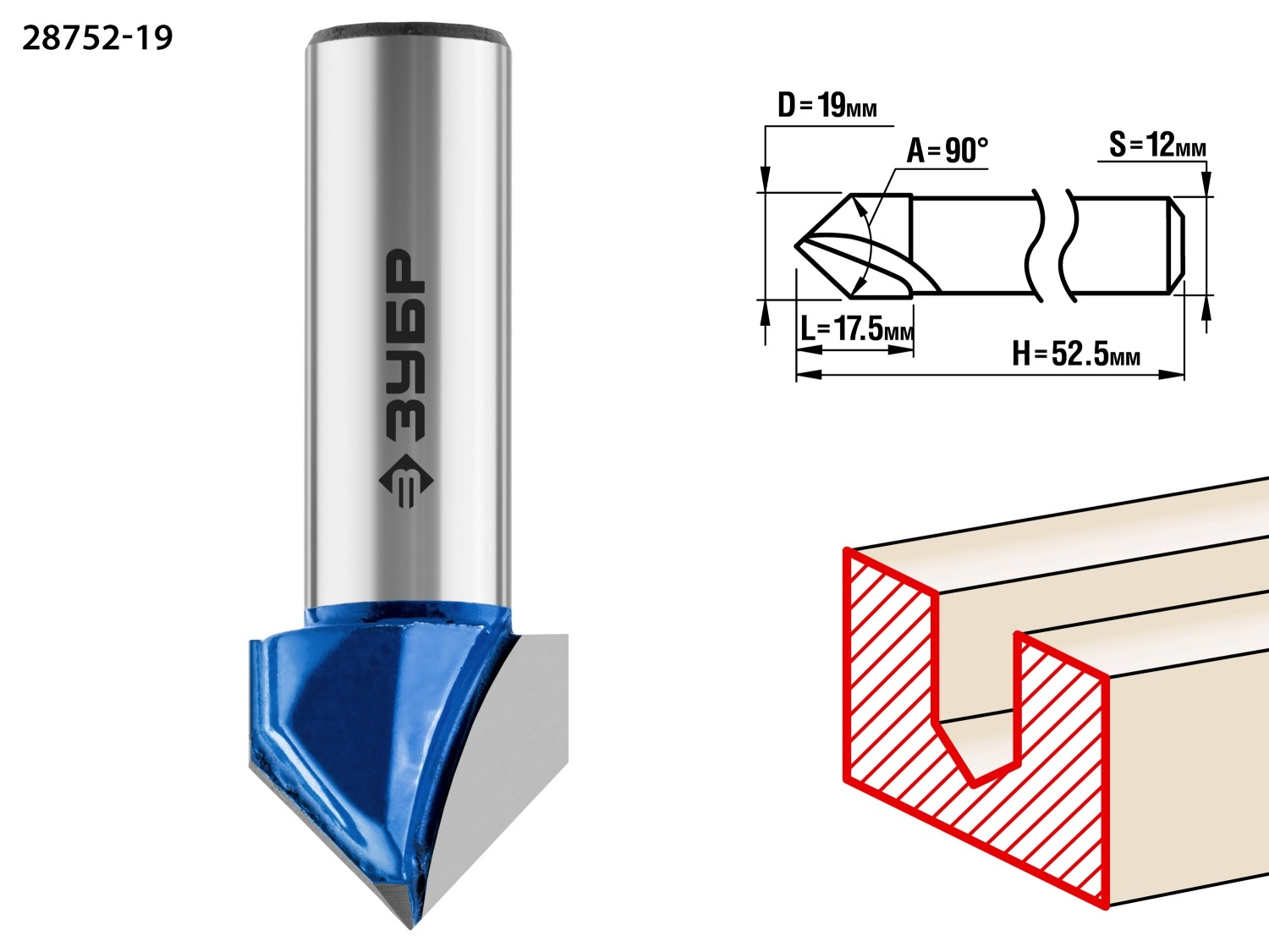ПроизводителиФреза паз. галтельная V-образная, D= 19мм, раб. дл.-17,5мм, угол-90° град., хв.-12мм (28752-19) ЗУБР