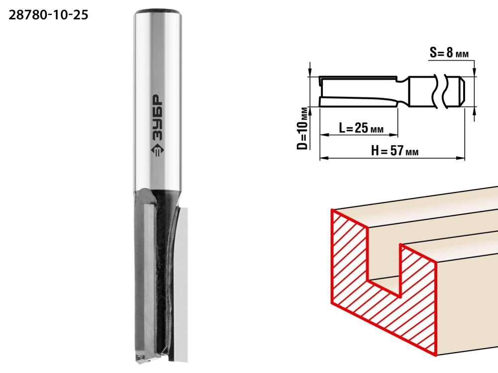 ПроизводителиФреза пазовая прямая, D=10 мм, рабочая длина-25 мм, хв.-8 мм (28780-10-25) ЗУБР