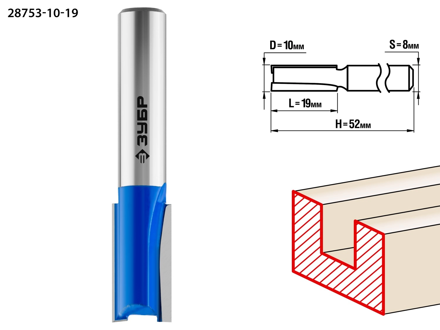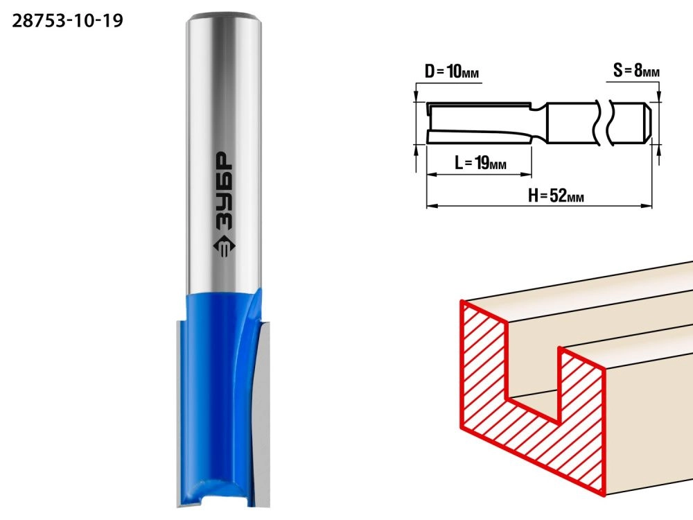 ПроизводителиФреза пазовая прямая, D= 10мм, рабочая длина-19мм, хв.-8 мм (28753-10-19) ЗУБР
