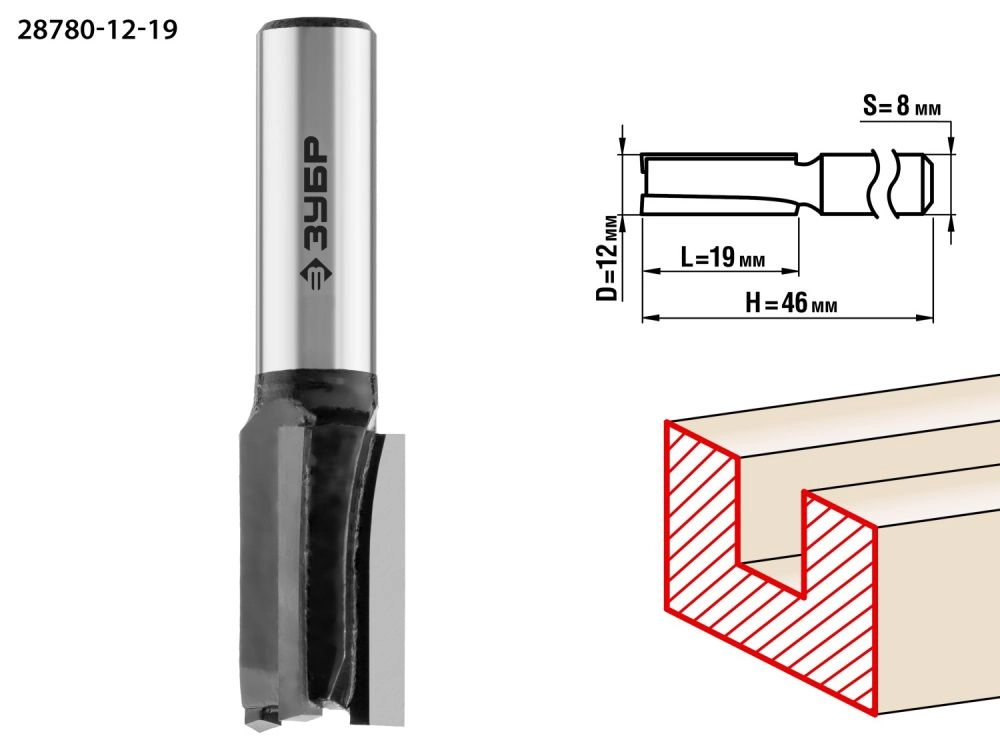 ПроизводителиФреза пазовая прямая, D=12 мм, рабочая длина-19 мм, хв.-8 мм (28780-12-19) ЗУБР
