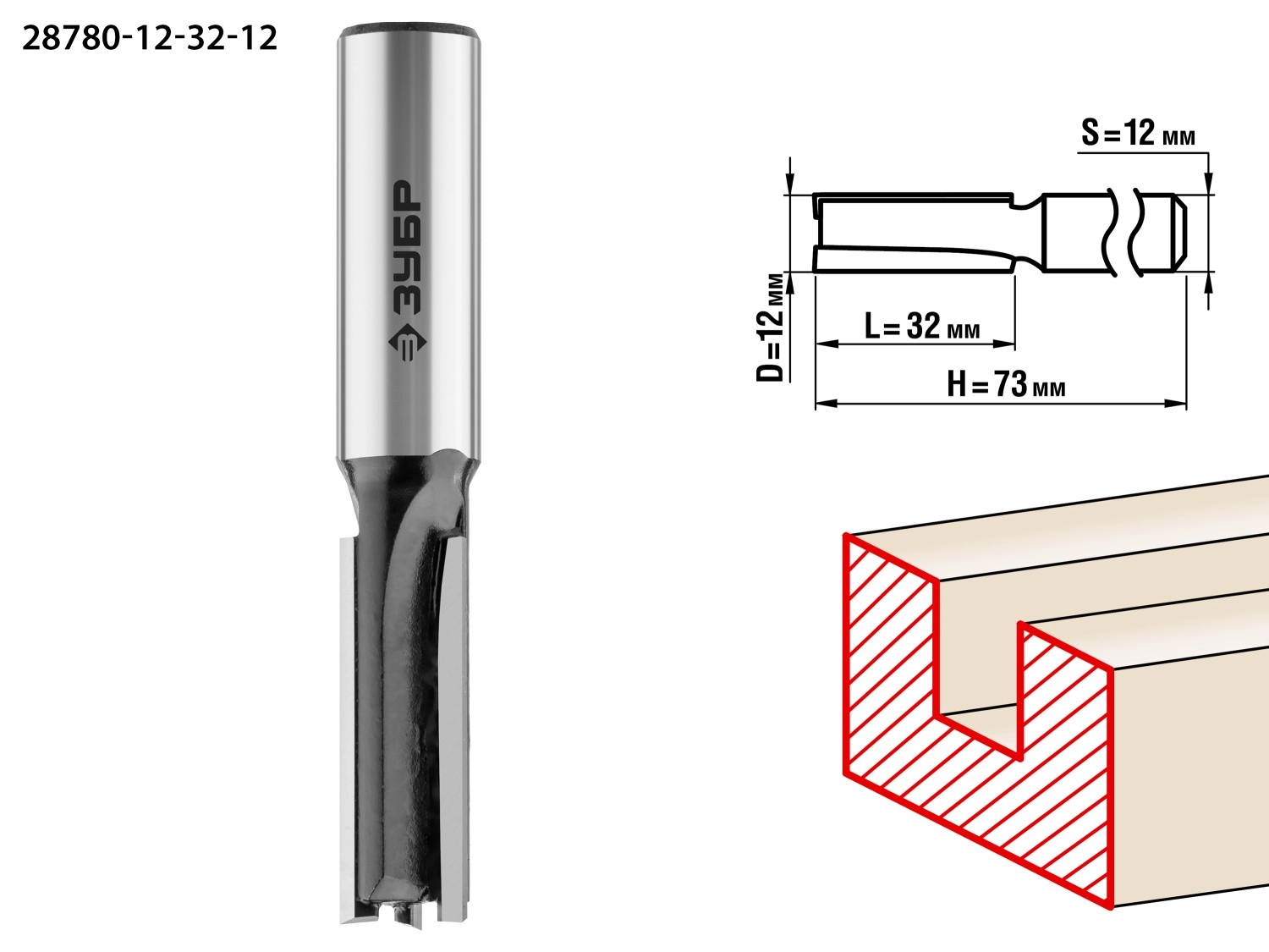 ПроизводителиФреза пазовая прямая, D=12 мм, рабочая длина-32 мм, хв.-12 мм (28780-12-32-12) ЗУБР