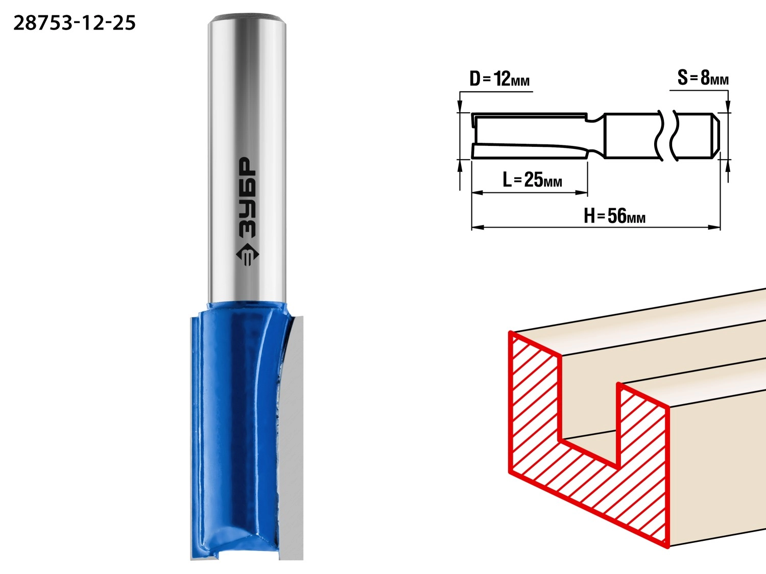ПроизводителиФреза пазовая прямая, D= 12мм, рабочая длина-25мм, хв.-8 мм (28753-12-25) ЗУБР