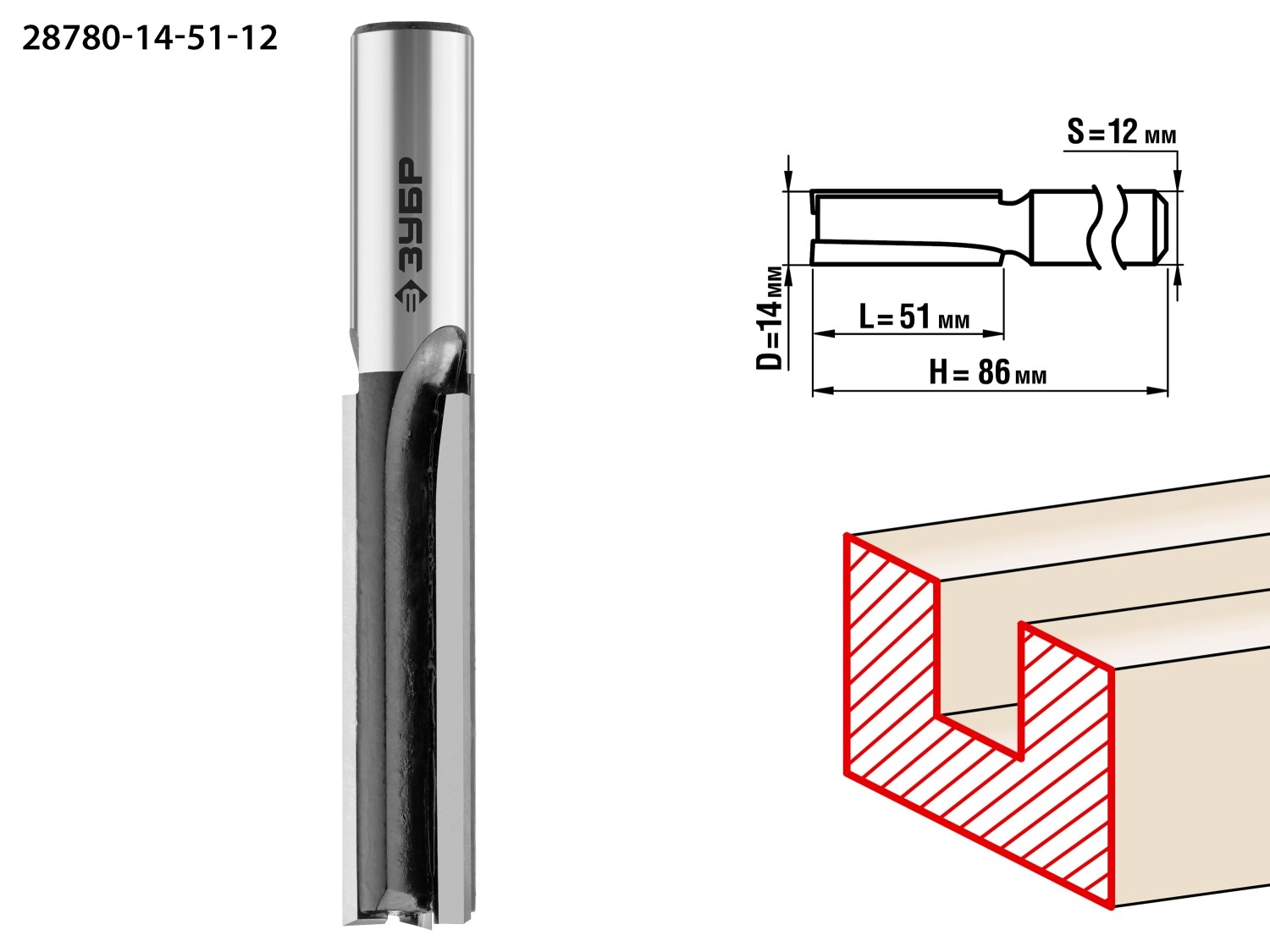 ПроизводителиФреза пазовая прямая, D=14 мм, рабочая длина-51 мм, хв.-12 мм (28780-14-51-12) ЗУБР