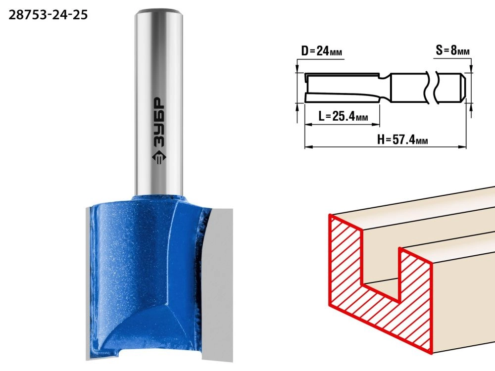 ПроизводителиФреза пазовая прямая, D= 24мм, рабочая длина-25мм, хв.-8 мм (28753-24-25) ЗУБР