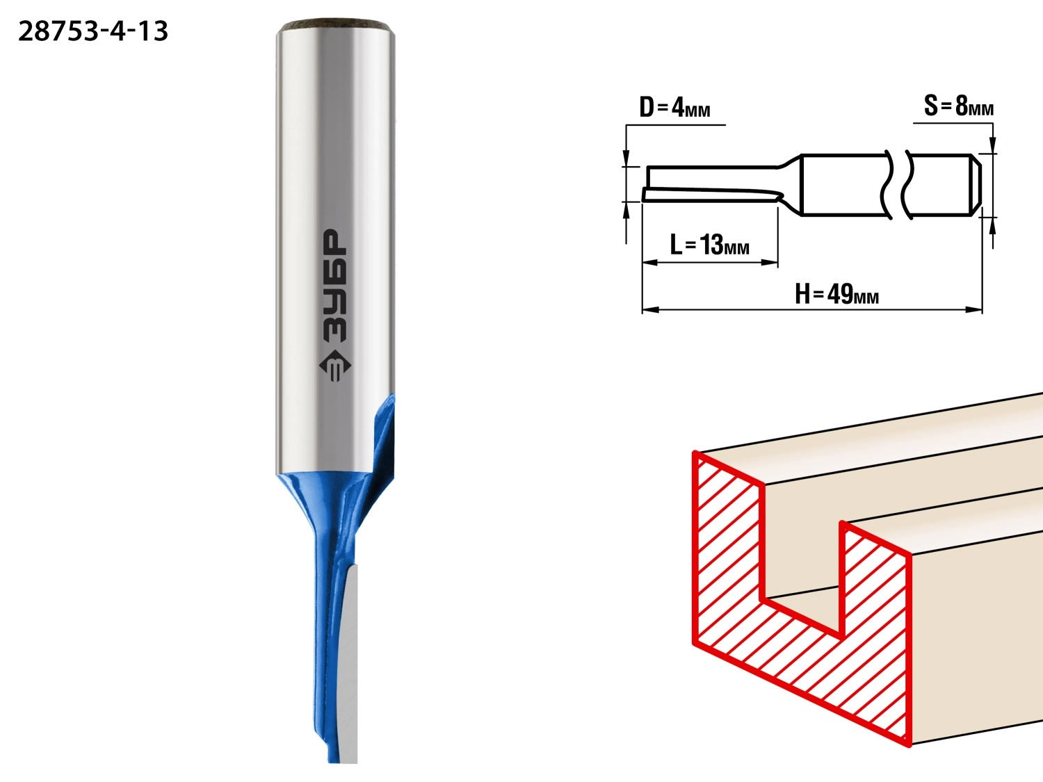 ПроизводителиФреза пазовая прямая, D= 4мм, рабочая длина-13мм, хв.-8 мм (28753-4-13) ЗУБР