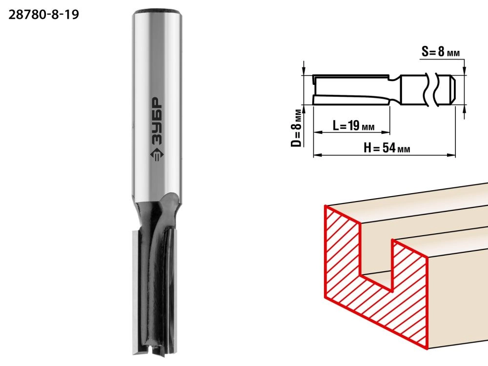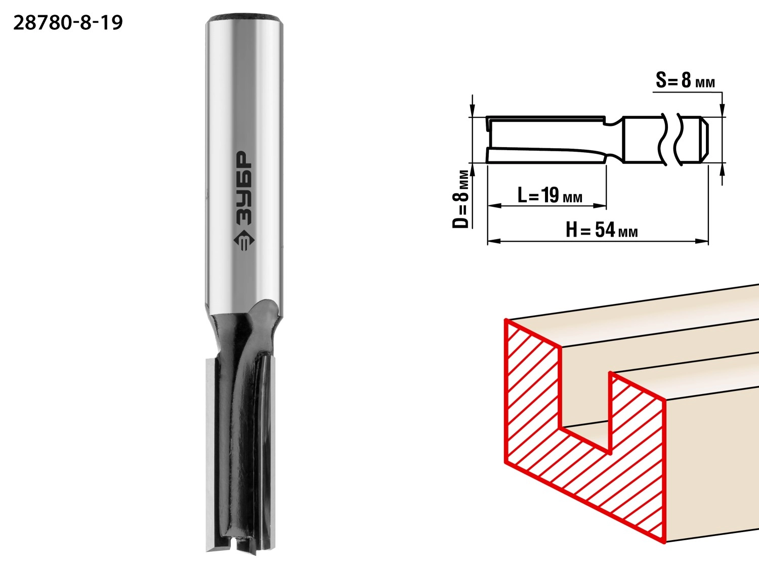 ПроизводителиФреза пазовая прямая, D=8 мм, рабочая длина-19 мм, хв.-8 мм (28780-8-19) ЗУБР