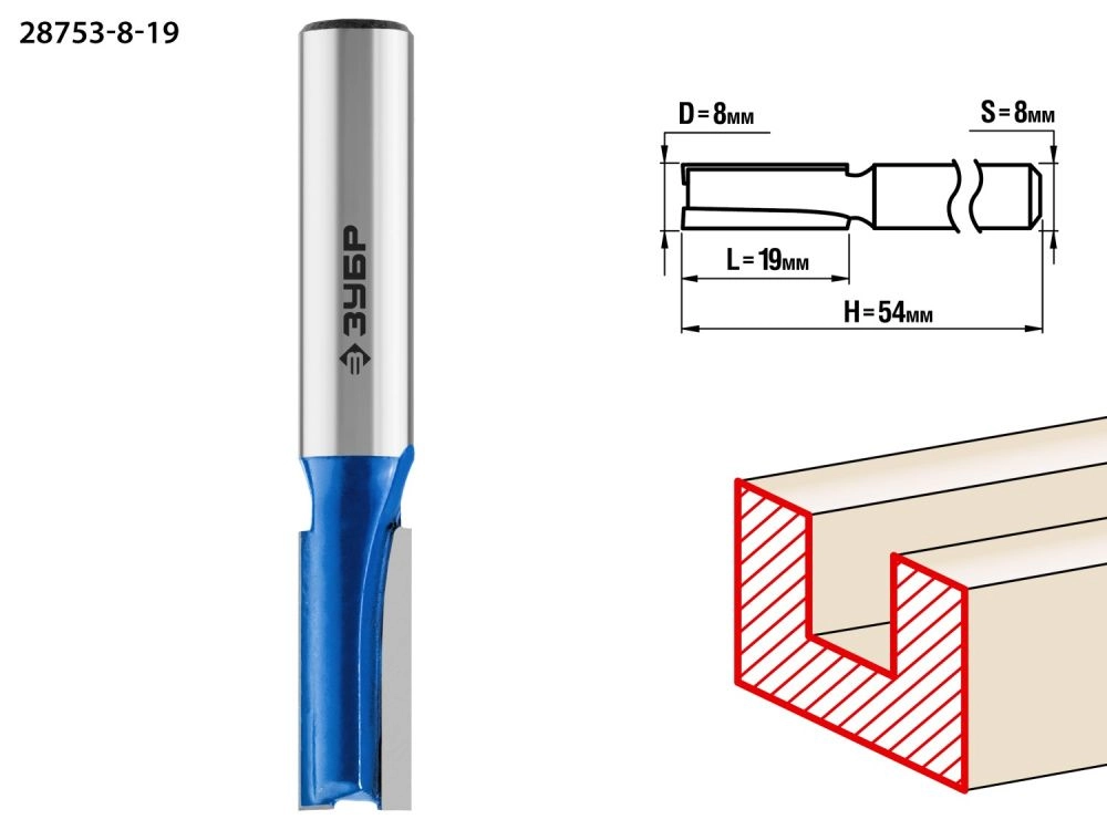 ПроизводителиФреза пазовая прямая, D= 8мм, рабочая длина-19мм, хв.-8 мм (28753-8-19) ЗУБР