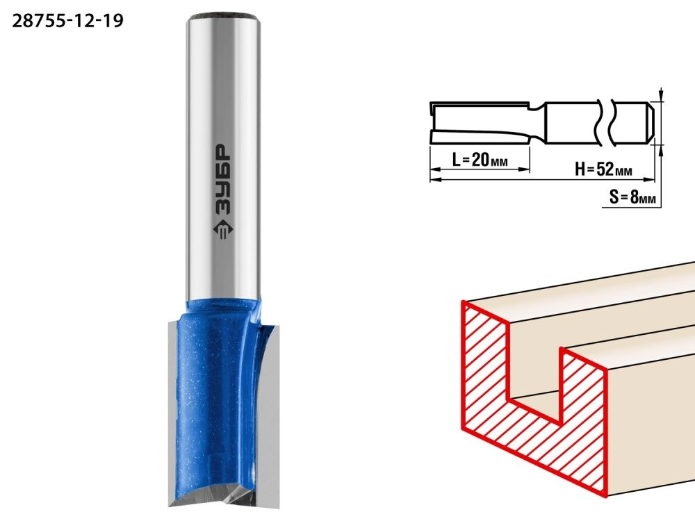 ПроизводителиФреза пазовая прямая с нижними подрезателями, D= 12мм, раб. длина-20мм, хв.-8 мм (28755-12-19) ЗУБР