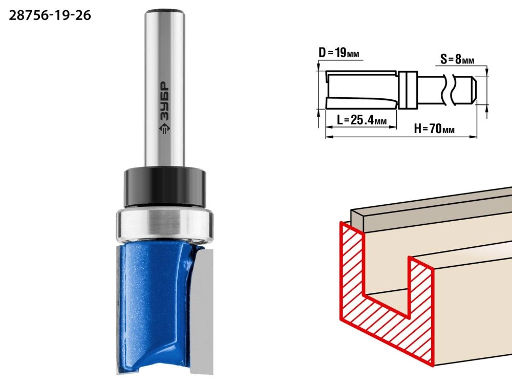 ПроизводителиФреза пазовая прямая с верхним подшип., D= 19мм, раб. дл.-25,4мм, хв.-8мм, d-19мм (28756-19-26) ЗУБР