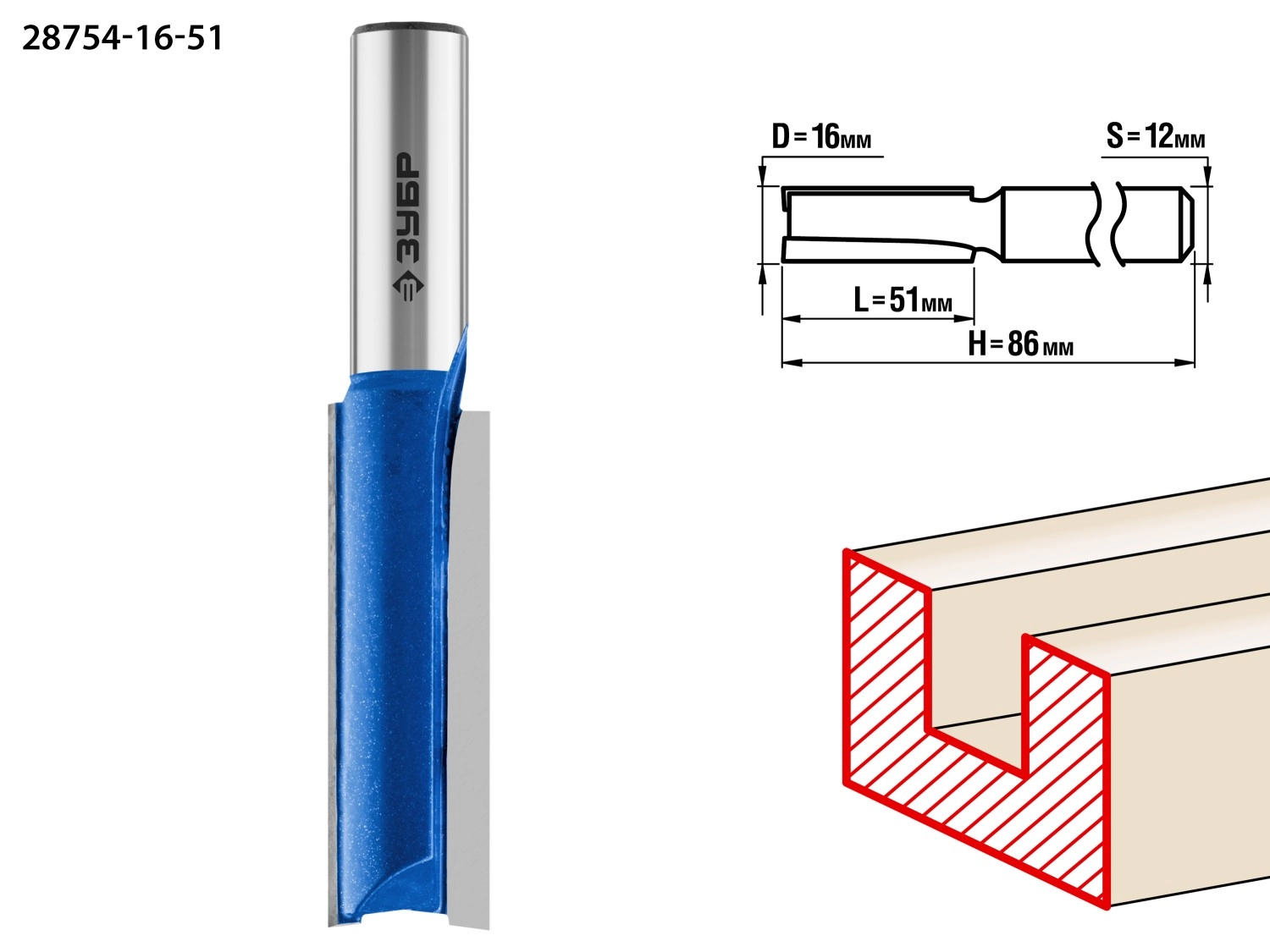 ПроизводителиФреза пазовая прямая, удлиненная, D= 16мм, рабочая длина-51мм, хв.-12 мм (28754-16-51) ЗУБР