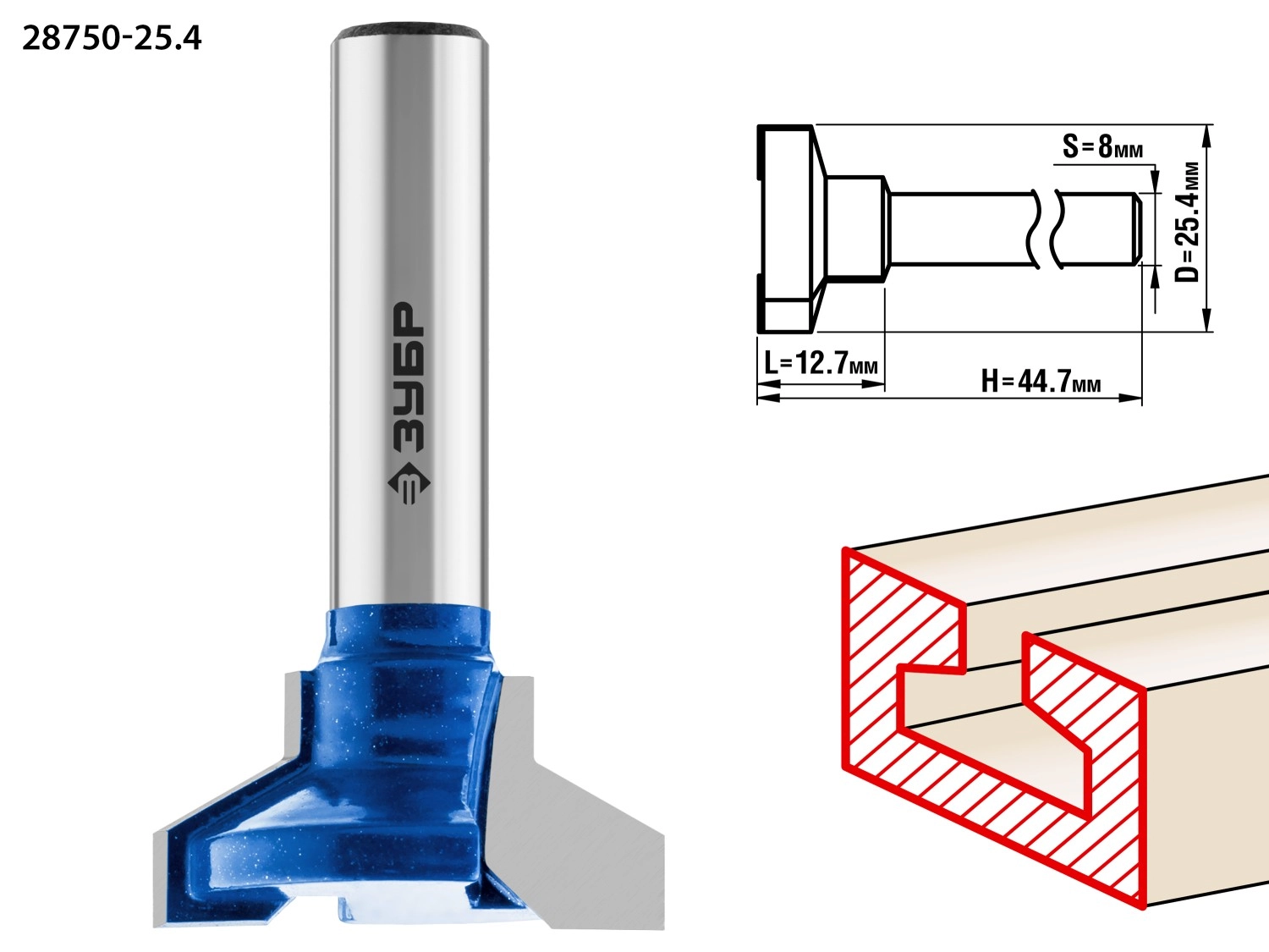 ПроизводителиФреза паз. Т-образная №2, D= 25,4мм, высота-12,7мм, вугол накл.-30 град., хв.-8мм (28750-25.4) ЗУБР