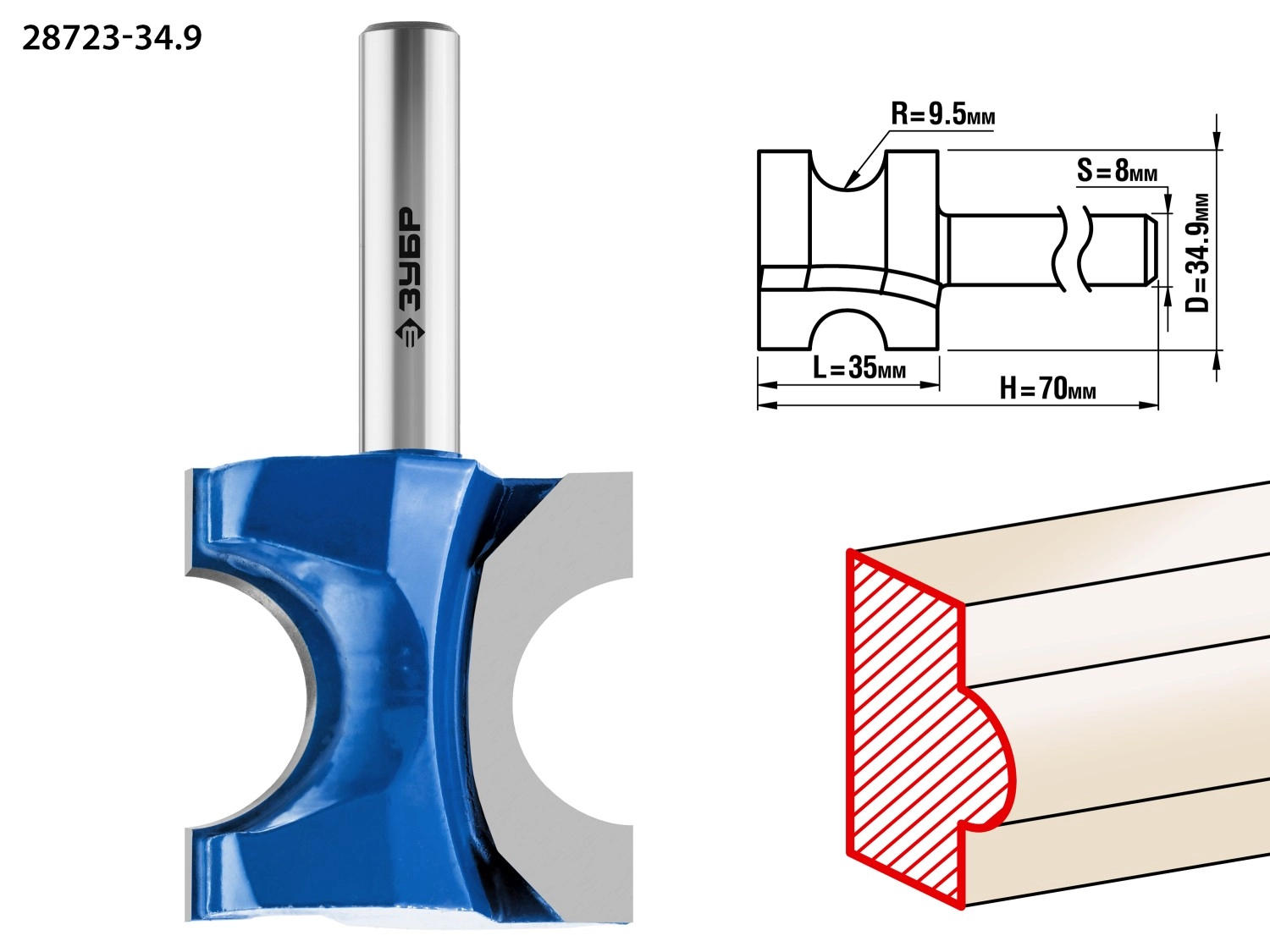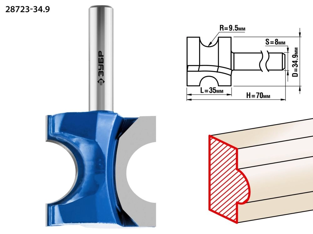 ПроизводителиФреза полустержневая, D= 34,9мм, рабочая длина-35мм, радиус-9,5мм, хв.-8 мм (28723-34.9) ЗУБР