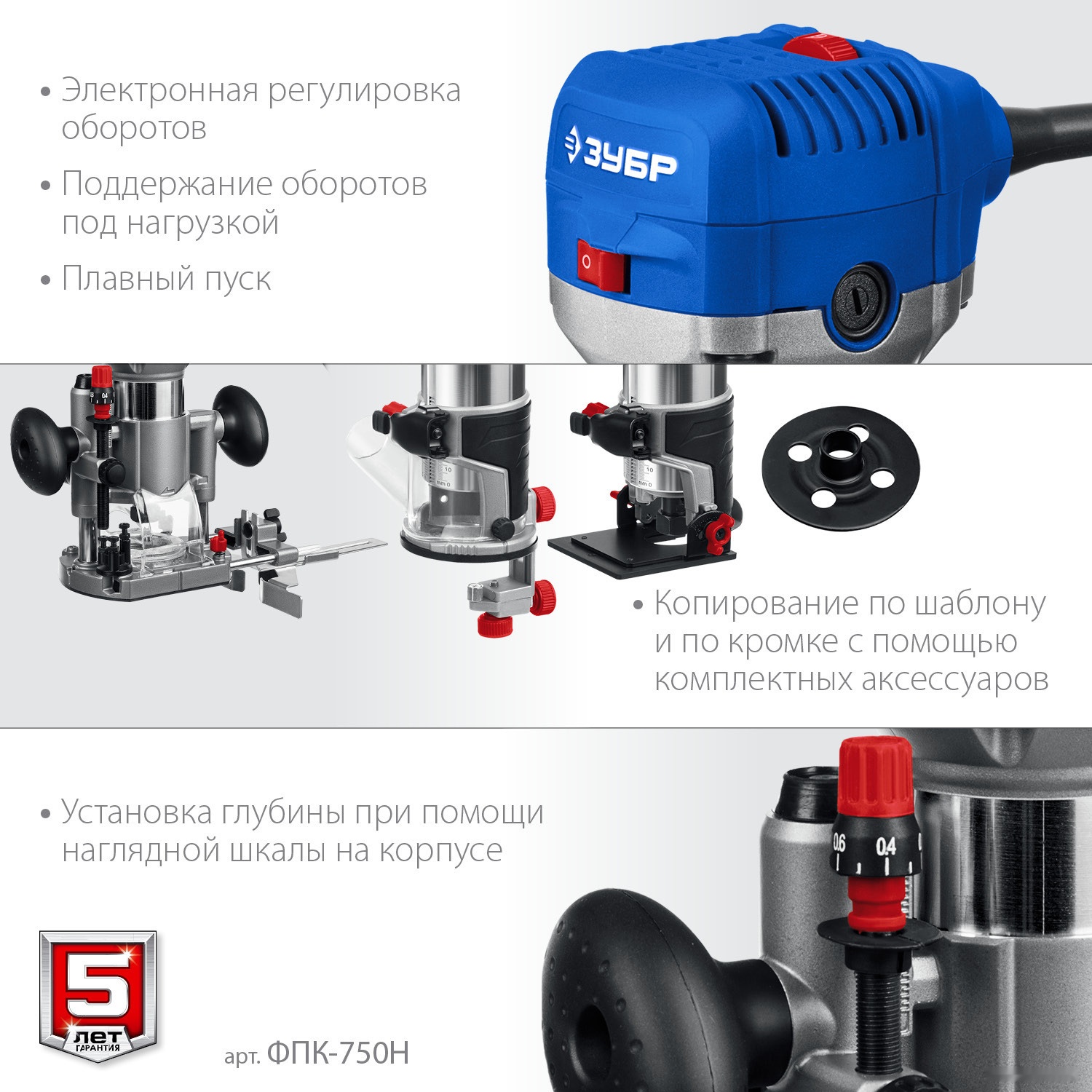 ХарактеристикиАртикул ФПК-750НБренды ЗубрСтрана производства КитайТип вертикальныйПотребляемая мощность 750Подсветка рабочей зоны естьВес 1.8Частота вращения (холостой ход) 33000Диаметр хвостовика фрезы 6 мм, 8 ммРабочий ход (глубина) 20"Константная" электроника естьПодключение к пылесосу естьПлавный пуск двигателя естьЦанговые патроны 2Ключи естьПараллельный упор естьПереходник для пылесоса естьПылесборник нетРегулировка оборотов ДаОписание товара обновлено 08.12.2025 13:49:19Фрезер кромочный ЗУБР – компактное изделие для удобства обработки кромок. Достаточная мощность, два размера цанг для использования разных типов фрез. Подсветка помогает при работе у условиях недостаточного освещения. Электронные системы позволяют использовать изделие с полной отдачей и быть уверенным в своей безопасности. Удобство хранения и переноски благодаря сумке в комплекте