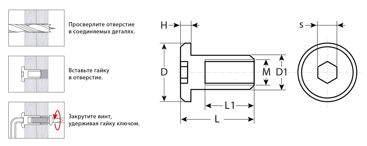 Для создания разъемного резьбового соединения в мебельном производстве, стяжки деталей и конструкций. Гайка устанавливается в заранее подготовленное отверстие, равное или чуть больше внешнего диаметра гайки. Фиксация гайки происходит при помощи винта с метрической резьбой. Для затягивания соединения используется торцевой шестигранный ключ.Производитель: Крафтул И/Е Гмбх, Альтер Поствег Штр., Лоенинген, Германия