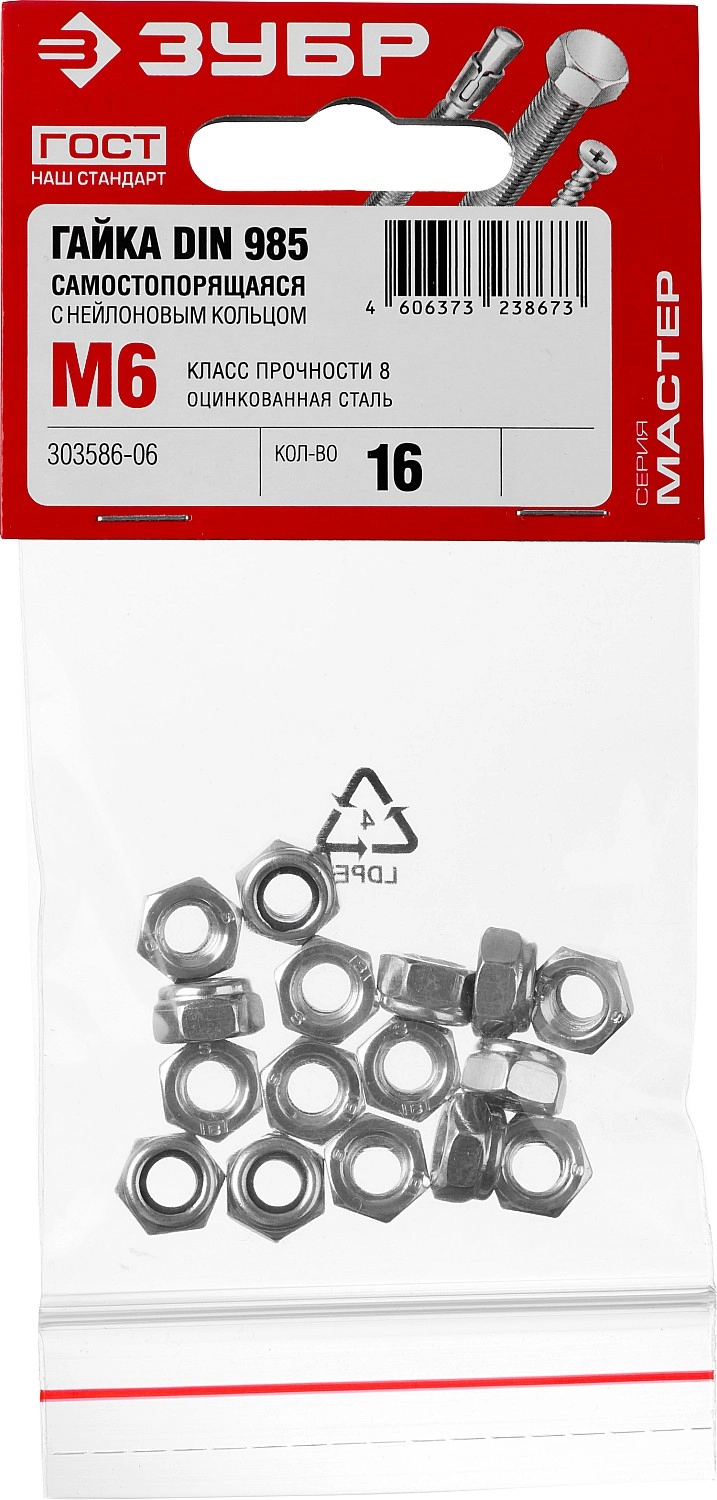 ПроизводителиГайка самоконтрящаяся с нейлоновым кольцом M6 DIN 985 кл. пр. 6.0 оцинк. 16шт. (303586-06) ЗУБР