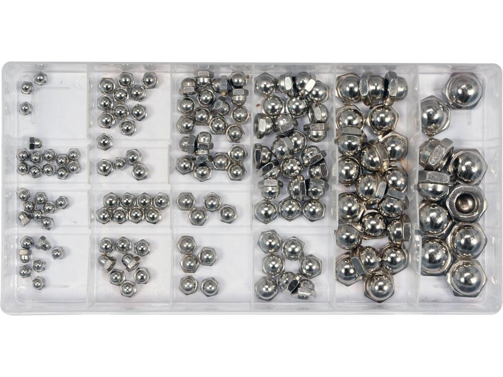 Набор из 150 штук метрических накидных/закрытых гаек. В комплект входят размеры М3, М4, М5, М6, М8, М10.Производитель: ТОЯ А.О. (TOYA S.A.), 51-168 Вроцлав, ул. Солтысовицка, 13-15, Польша