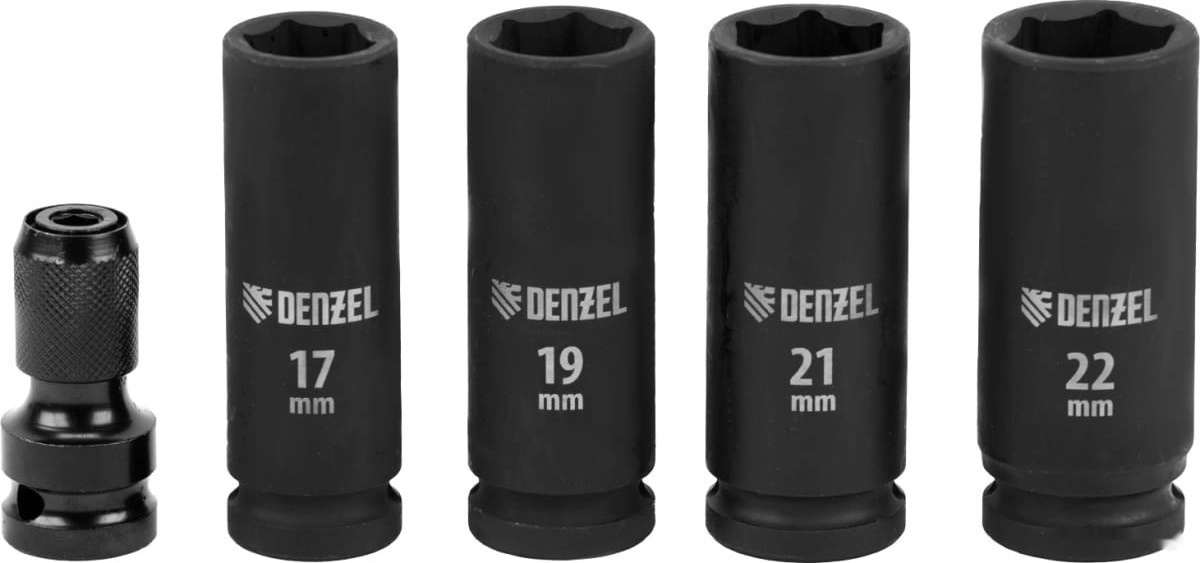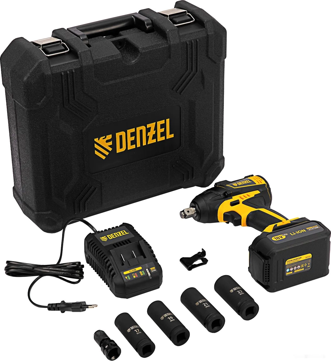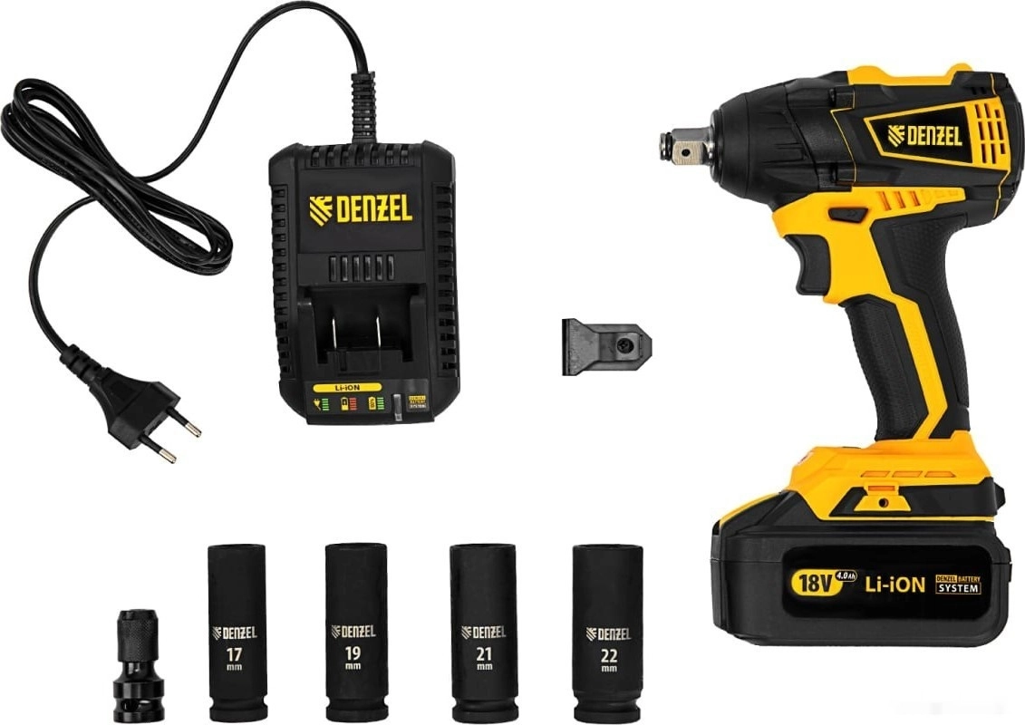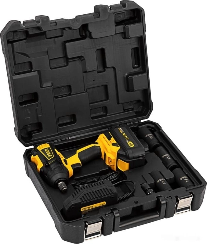 - Полная готовность к работе — в комплект входит зарядное устройство, аккумулятор, адаптер HEX 1/4 дюйма и 4 ударные торцевые головки размером 17, 19, 21 и 22 мм.