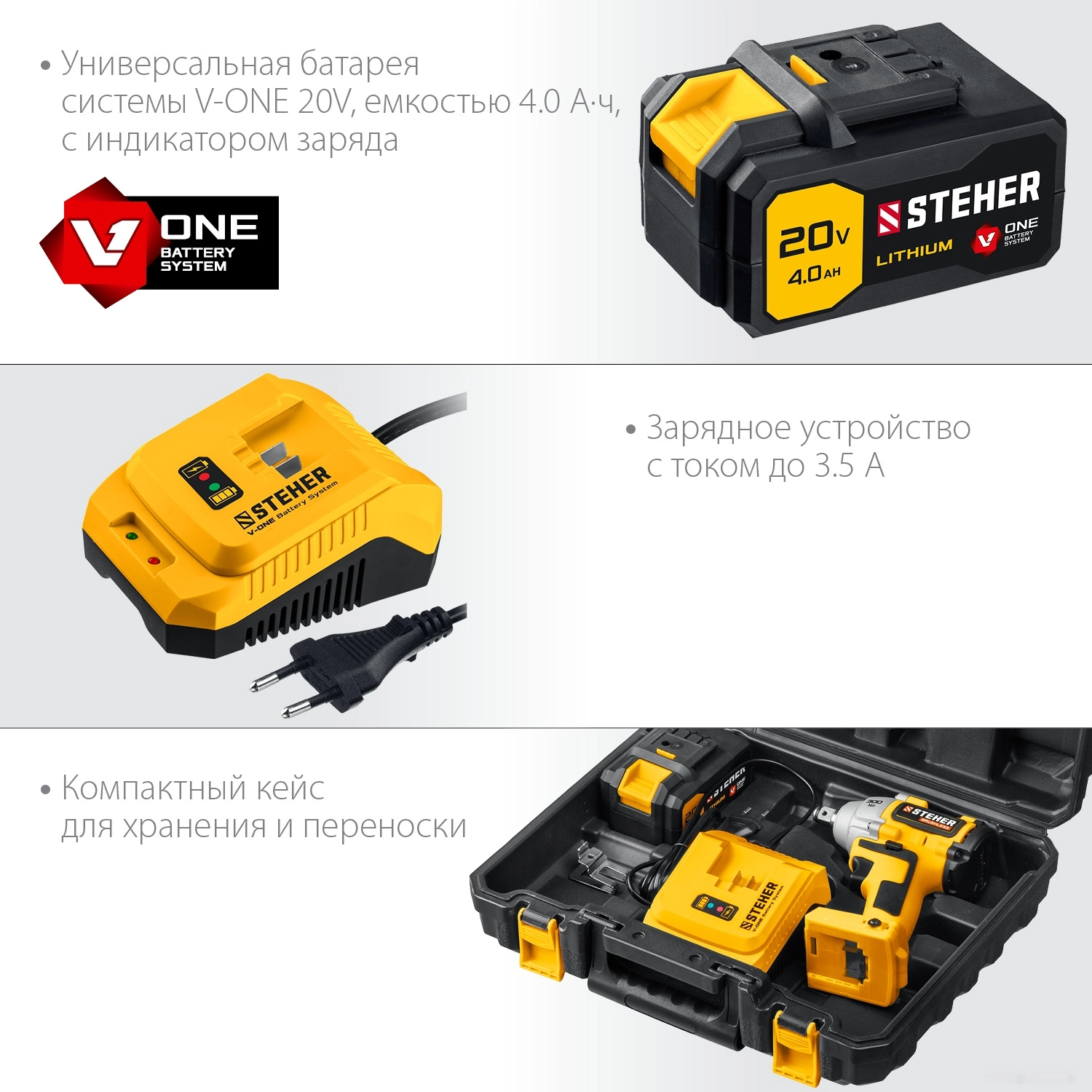 ПроизводителиГайковерт ударный аккум. CWB-300-1 (20.0 В, 1 аккум. х 4.0 А/ч, 1/2", 300 Нм, чем.) STEHER