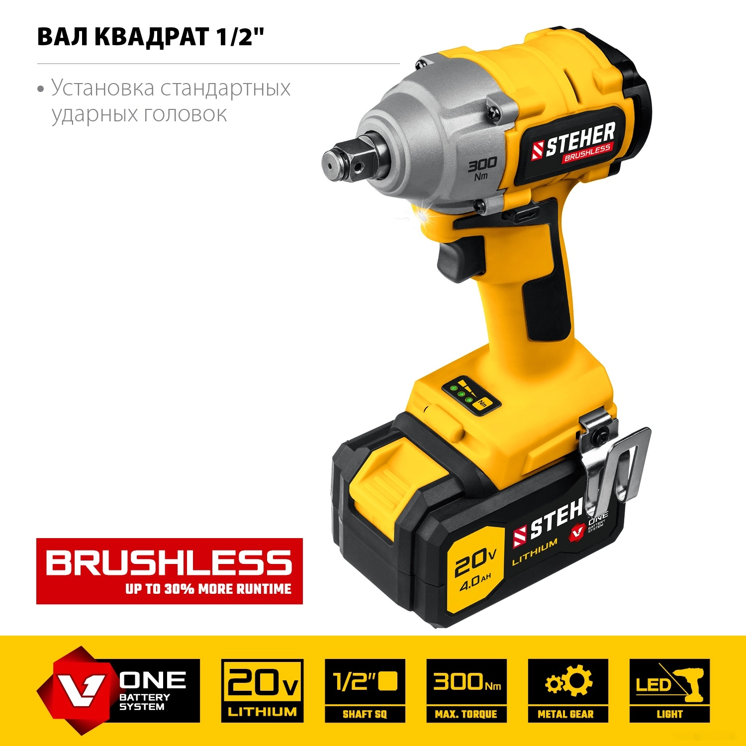 ПРОФИУровень качества. При классификации продуктов, имеющих схожее наименование, но обладающие различными потребительскими свойствами мы приняли следующий Вес факторов: 80% - подтвержденный ресурс, 15% - заявленная производительность/скорость, 5% - субъективные ощущения потребителя. ПодробнееКод товара: 0056461(0)Производительное изделие с передовым BRUSHLESS двигателем. Высокий крутящий момент в совокупности с большим ресурсом двигателя делают гайковерт необходимым инструментом в автосервисе, на строительной площадке и сборочном производствеХарактеристикиАртикул CWB-300-1Бренды STEHERСтрана производства КитайАккумуляторная система STEHER 20BТип патрона 1/2Количество скоростей 1Макс. крутящий момент 300Число оборотов холостого хода 2300Напряжение аккумулятора 20Число ударов 3300Скорость вращения 2300Емкость аккумулятора 4Индикация заряда батареи ДаТип аккумулятора Li-IonКейс в комплекте естьАккумулятор в комплекте ДаВес 1700Питание аккумуляторКрутящий момент 300Кейс ДаДлина 280Ширина 95Высота 330Реверс естьПодсветка естьБесщеточный двигатель ДаВремя зарядки 90Способ крепления аккумулятора слайдерФиксация кнопки включения НетРегулировка крутящего момента 3Регулировка оборотов ДаОписание товара обновлено 08.12.2025 14:34:03Гайковерт STEHER CWB-300-1, предназначен для заворачивания/отворачивания крепежа (при сборке/разборке металлических конструкций, снятии/установке колес автомобиля и т.д.).