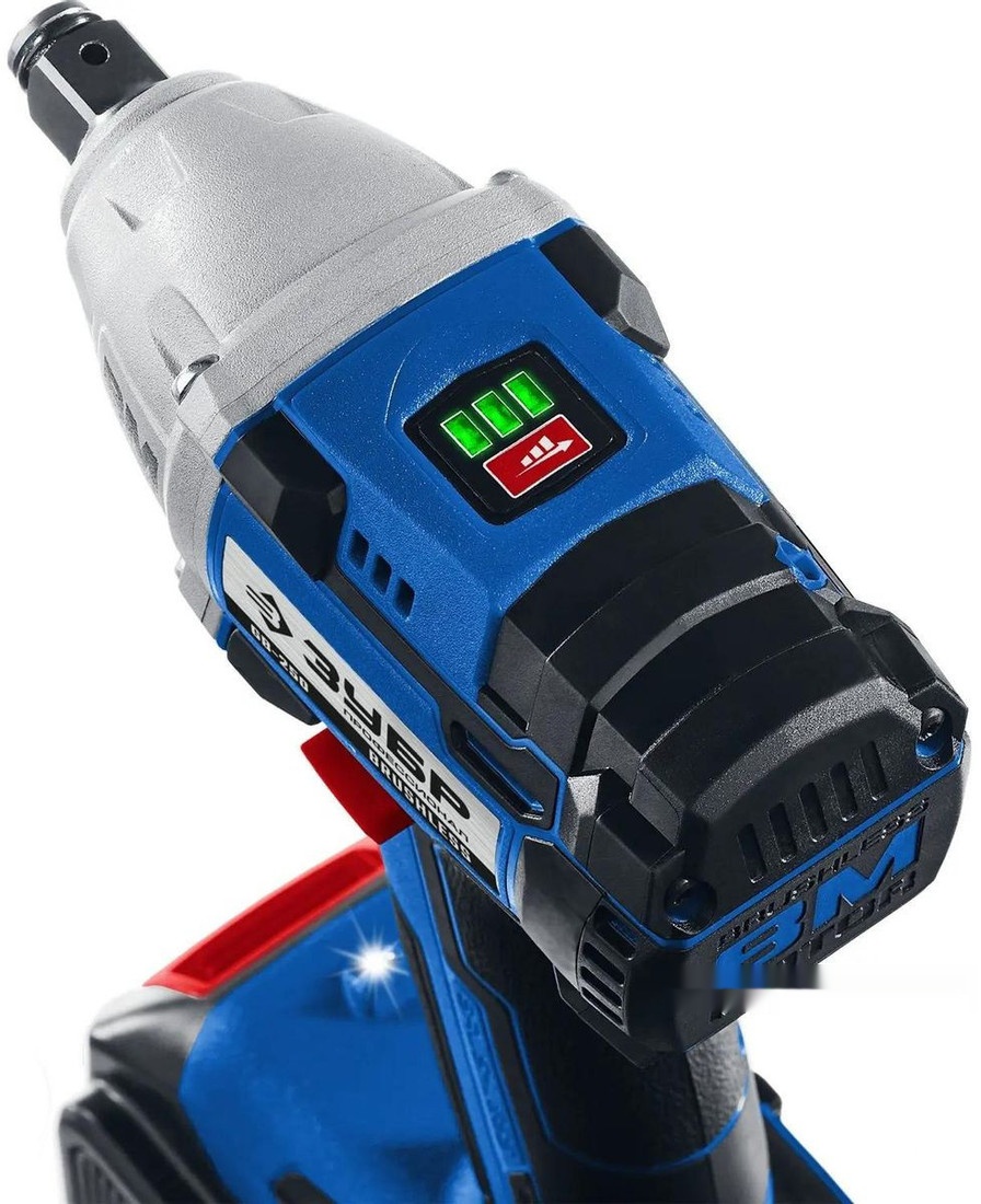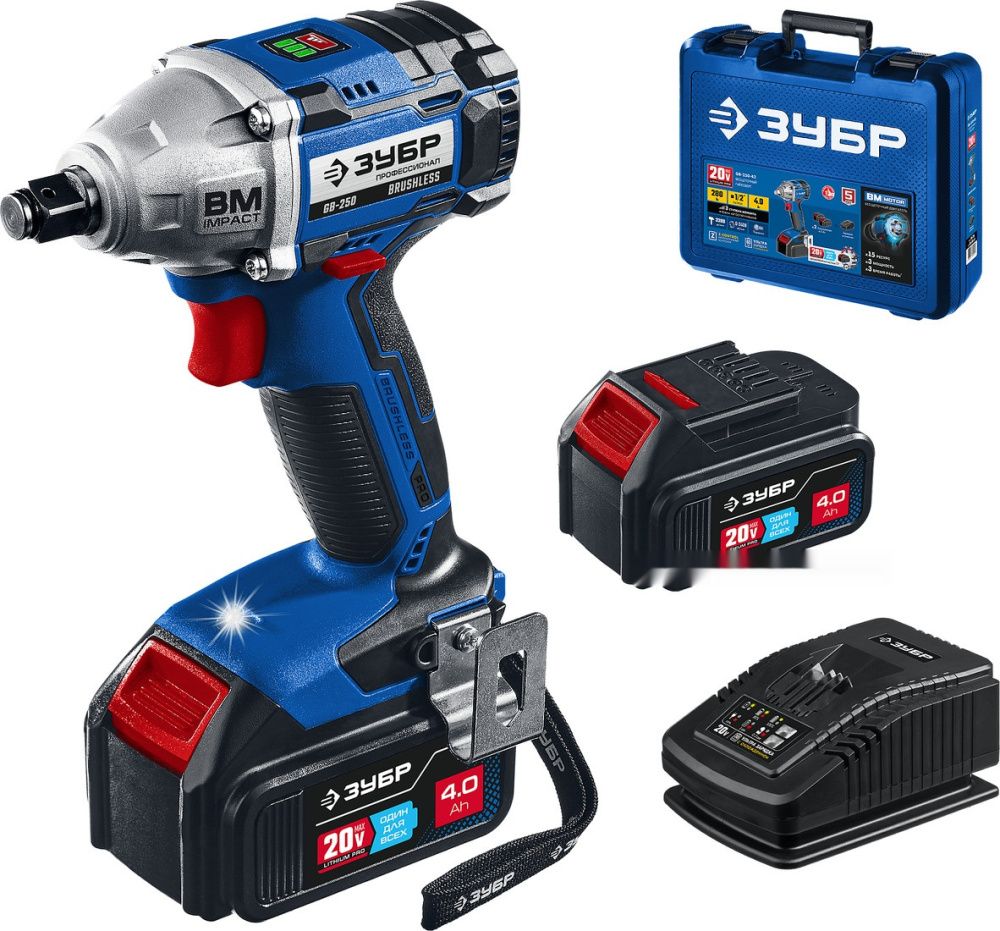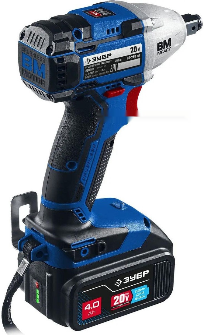 ПроизводителиГайковерт ударный аккум. GB-250-42 (20.0 В, 2 акк. х 4.0 А/ч Li-Ion, 1/2", 280 Нм, чем.) Проф. ЗУБР
