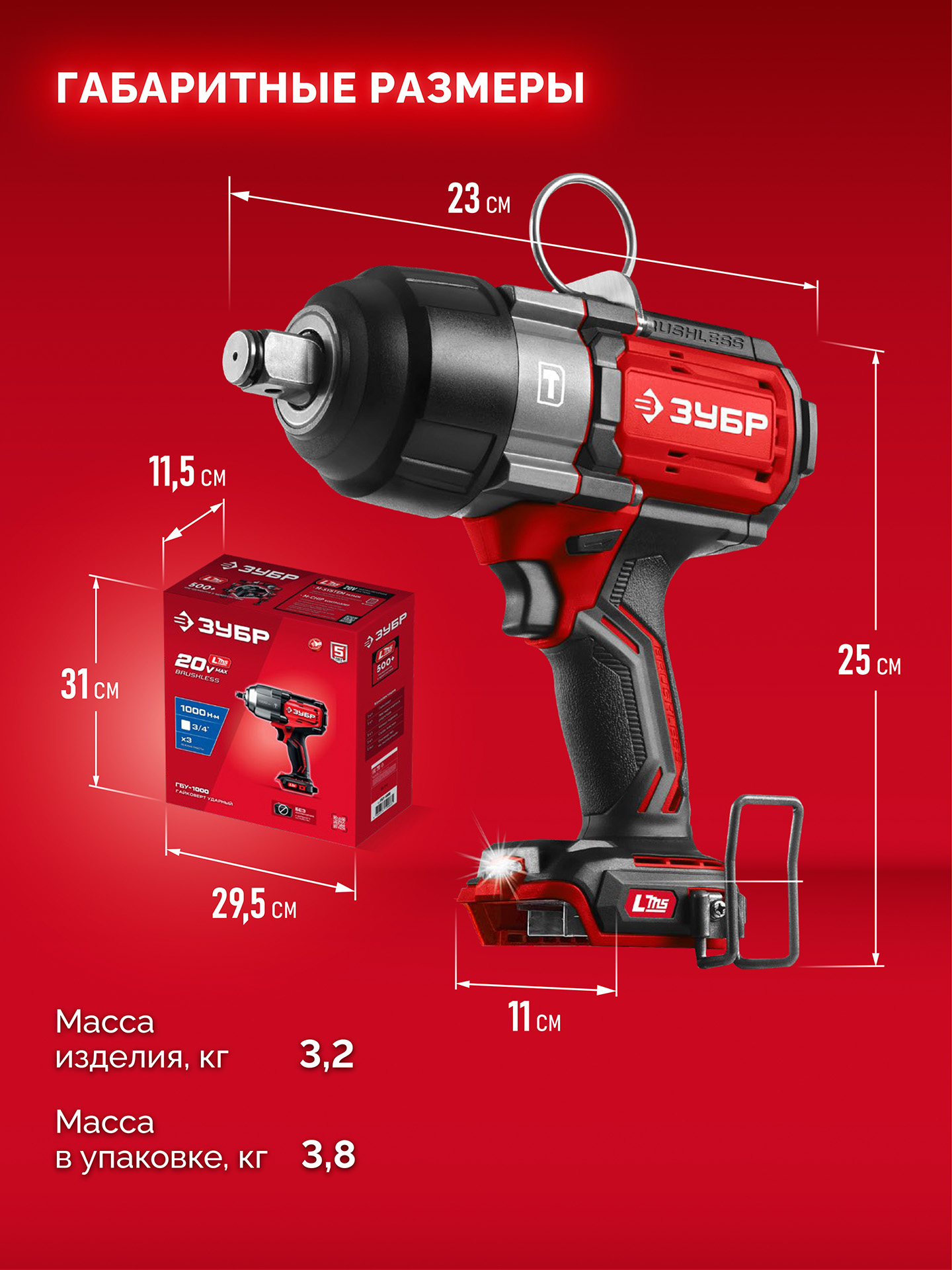 ПроизводителиГайковерт ударный аккум. ГБУ-1000 (LMS) (20.0 В, без АКБ и ЗУ, 3/4, 1000 Нм, кор.) ЗУБР