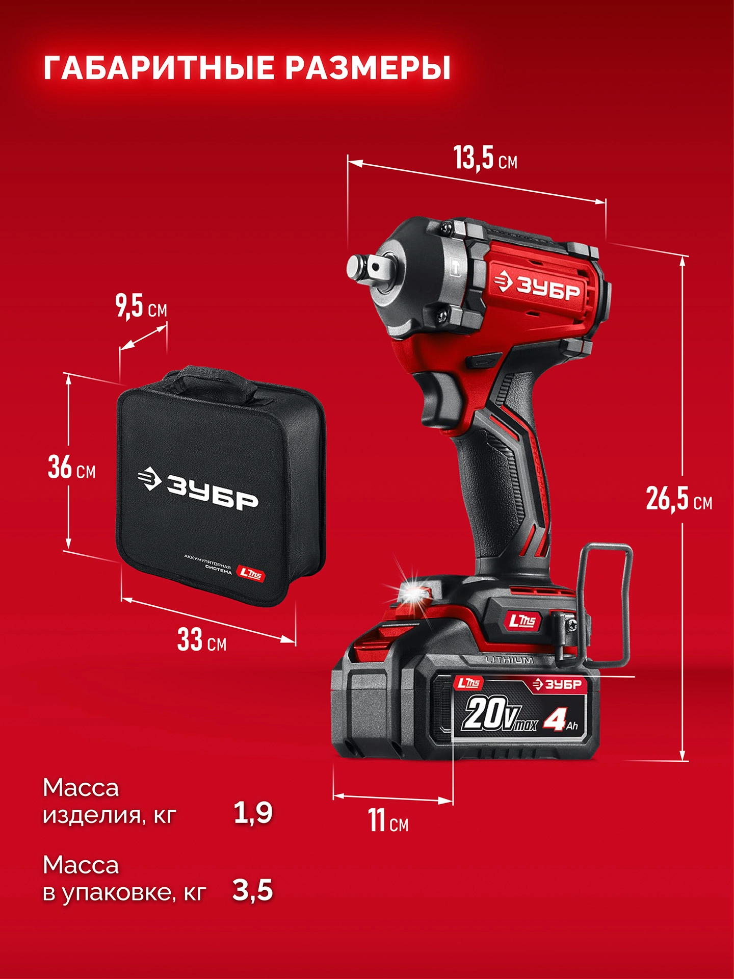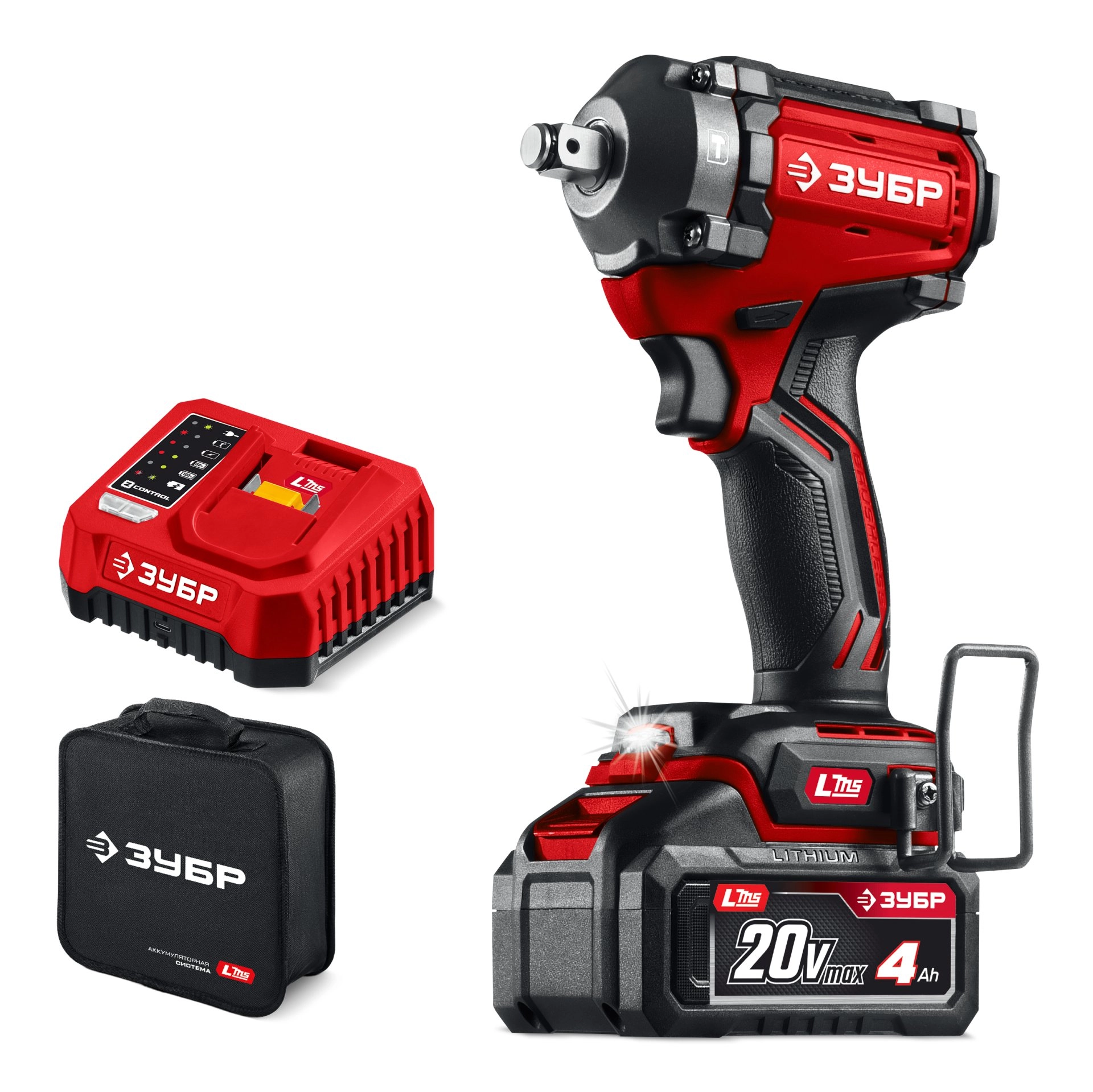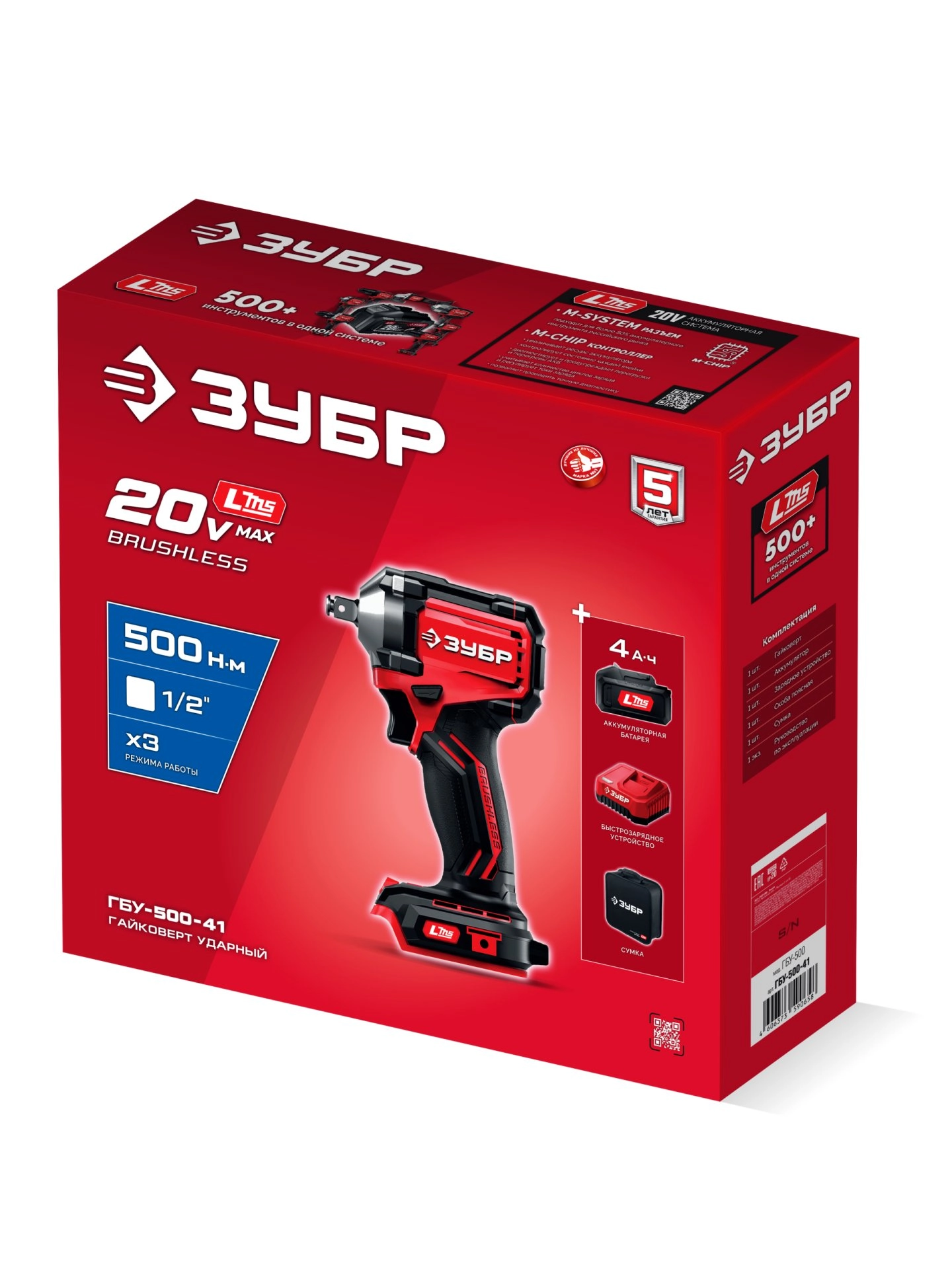 ПроизводителиГайковерт ударный аккум. ГБУ-500-41 (LMS) (20.0 В, 1 акк. х 4 A/h Li-Ion, 1/2, 500 Нм, сум.) ЗУБР