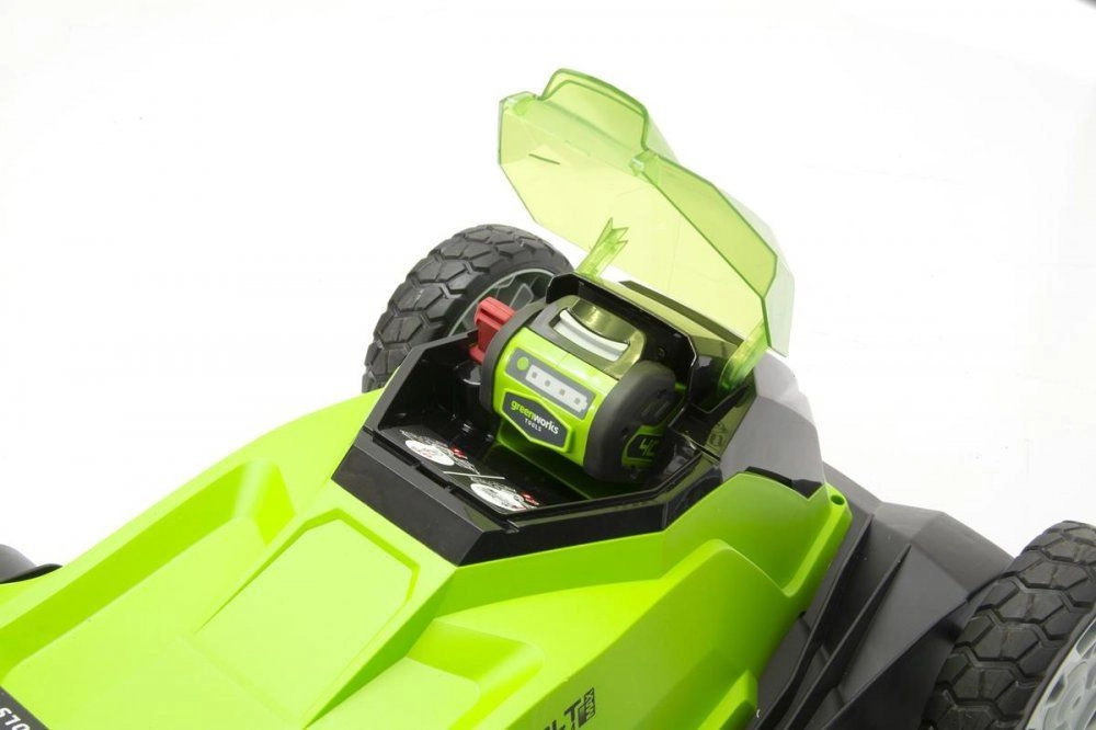 Автономное время работы - до 600 м² от 4 А.ч. батареи (примерное время работы, и зависит от некоторых факторов). Для защиты от случайного включения, предусмотрен специальный ключ безопасности и кнопка-предохранитель. Для удобства хранения ручка газонокосилки складывается. Особенно рады такой новинке будут женщины потому, что её не нужно заполнять бензином, обслуживать и вообще совершать какие либо манипуляции, известные, как правило, только мужчинам. А если еще подумать о своем здоровье (отсутствие выхлопов СО2) и экологии, то эта косилка будет самым разумным вложением средств. Газонокосилка работает от аккумуляторной батареи G-MAX 40В.