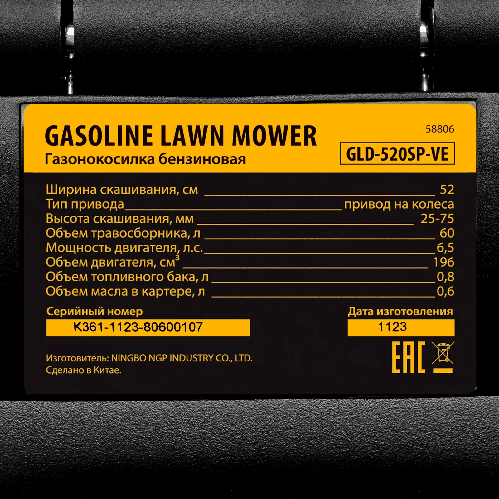 ХарактеристикиАртикул 58806Бренды DENZELСтрана производства КитайТип бензиноваяШирина скашивания 52Материал корпуса стальВес 45.2Материал колесных дисков пластикМощность двигателя 6.5Двигатель бензиновыйПривод заднийСамоходная естьСкорость вращения двигателя 2900Емкость топливного бака 0.8Объём травосборника 60Мульчирование естьМатериал деки стальТип скашивания сбор в травосборникТравосборник комбинированныйСкорость движения 3.5Уровень шума 98Количество колес 4Цикл двигателя 4-х тактныйРабочий объём двигателя 196Мин. Высота скашивания 25Регулировка высоты скашивания центральнаяМакс. Высота скашивания 75Система запуска ручной, электростартерСкладная ручка ДаРекомендуемая площадь скашивания 1800Регулировка ручки по высоте ДаКоличество уровней высоты скашивания 7Вид топлива бензин АИ-92Боковой выброс травы ДаЗадний выброс травы ДаОбъем масляного бака 0.6Режущая система роторный ножОписание товара обновлено 08.12.2025 14:44:04Создать садово-парковый, спортивный, партерный или другой вид газона легко с моделью GLD-520SP-VE.