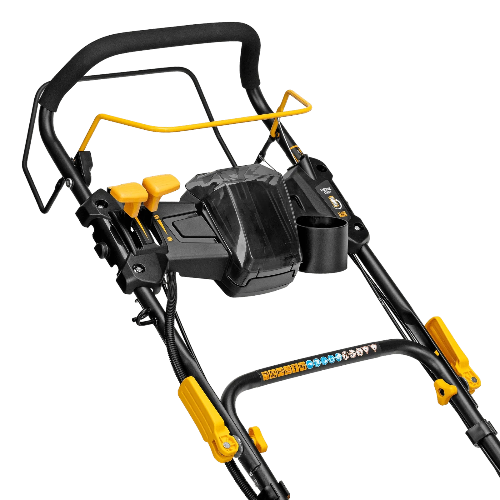 Ключевая особенность газонокосилки - наличие электростартера, значительно упрощающего запуск двигателя, и вариатора, позволяющего регулировать скорость движения.
